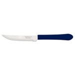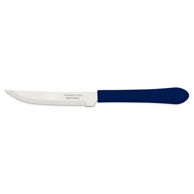 Faca para Churrasco Tramontina Leme com Lâmina em Aço Inox e Cabo de Polipropileno Azul 4" Tramontina - Deixe a composição da sua mesa muito mais especial e saboreie seus cortes de carne preferidos, com a faca para churrasco Tramontina Leme com lâmina em aço inox e cabo de polipropileno azul 4 polegadas. Ideal para uso diário, ela tem lâmina de aço inox com tratamento térmico e cabo de polipropileno, características que proporcionam maior resistência, durabilidade e excelente fio de corte. Ela ainda pode ir à máquina de lavar louças, facilitando seu dia a dia! Características Gerais do Produto: Garantia: • 3 Meses