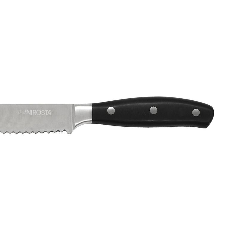 A faca para pão Fackelmann Nirosta em inox 33cm preta FK-43617 é um investimento inteligente para quem busca um utensílio de alta qualidade e design moderno. Sua durabilidade, facilidade de uso e design elegante a tornam uma peça indispensável em qualquer cozinha. Características: Marca: Fackelmann Modelo: Nirosta Graphite Material da lâmina: Aço Inox, ABS e PP Cor: Prata/Preto Material do cabo: Polipropileno Benefícios: Corte preciso: A lâmina serrilhada corta o pão de forma limpa e precisa, sem esmagar a miga. Durabilidade: O aço inoxidável garante que a faca dure por muitos anos, mesmo com o uso frequente. Facilidade de limpeza: A faca é fácil de limpar, podendo ser lavada à mão ou na máquina de lavar louça. Design elegante: O design moderno e a cor preta combinam com qualquer cozinha.