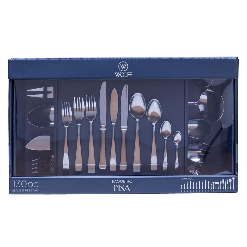 Faqueiro 130 Peças Wolff Pisa de Aço com Caixa LitografadaComplete sua mesa com requinte e versatilidade usando o Faqueiro 130 Peças de Aço Inox Pisa da Wolff. Com um design elegante e qualidade excepcional, este faqueiro é ideal para tornar suas refeições inesquecíveis.1. Design Elegante PisaCada peça do faqueiro apresenta o design refinado da linha Pisa, caracterizado por linhas elegantes e um acabamento impecável em aço inox. A harmonia entre forma e função proporciona um toque de sofisticação à sua mesa.2. Aço Inox Durável e ResistenteFabricadas em aço inox de alta qualidade, as peças do faqueiro oferecem durabilidade e resistência excepcionais. As lâminas afiadas garantem cortes precisos, enquanto os cabos proporcionam conforto durante o manuseio.3. Conjunto Completo para Todas as NecessidadesO faqueiro é composto por 130 peças, incluindo facas, garfos, colheres de mesa e sobremesa, além de utensílios adicionais. Versátil e completo, atende a diversas ocasiões, desde refeições diárias até eventos especiais.4. Versatilidade sem EstojoIdeal para quem busca praticidade, este faqueiro não inclui estojo, proporcionando uma solução versátil para o armazenamento das peças. Mantenha suas ferramentas de mesa organizadas de acordo com sua preferência.Eleve a experiência à mesa com o Faqueiro 130 Peças de Aço Inox Pisa da Wolff. Adquira o seu conjunto hoje e desfrute de refeições inesquecíveis com estilo e sofisticação.WOLFF. Elevando o padrão em receber, servir e decorar!Contém: 12 Facas De Mesa 12 Garfos De Mesa12 Colheres De Mesa12 Facas De Sobremesa12 Garfos De Sobremesa 12 Colheres De Sobremesa12 Colheres De Chá 12 Colheres De Café 1 Garfo De Salada1 Colher De Salada1 Concha1 Colher De Arroz1 Colher De Açúcar 1 Garfo De Servir Peixe Ou Pá P/ Bolo12 Faca De Peixe12 Garfo De Peixe1 Espátula De Peixe1 Concha De Molho1 Faca De Assado1 Garfo De AssadoForno: NãoFogão: NãoMedidas Produto: Altura 1,00cm x Largura 1,00cm x Comprimento 1,00cmPeso: 0,10KgCor: InoxMaterial: Aço InoxLavar com detergente neutro, esponja macia e secar imediatamente. Não utilizar outros produtos químicos.