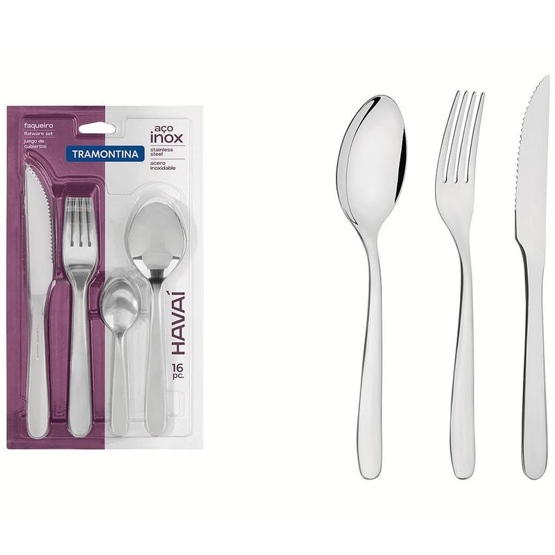 O Faqueiro Tramontina Havaí em Aço Inox com 16 peças é perfeito para atender suas necessidades do dia a dia na hora das refeições. Se encaixa em qualquer ambiente e em diferentes ocasiões. As 16 Peças contam com a qualidade do aço inox e um charmoso acabamento em brilho, que embeleza sua mesa. Talheres versáteis que facilitam também na hora da limpeza, podendo ser lavados diariamente na máquina de lavar louças e com características únicas e pensadas para você. Aproveite!
