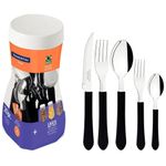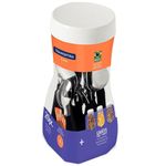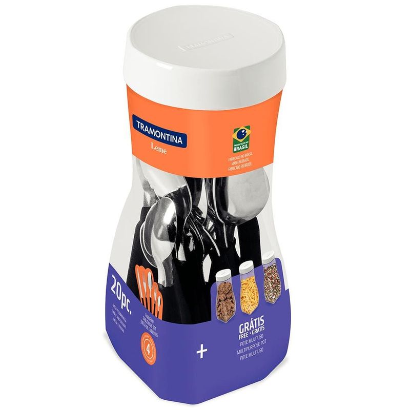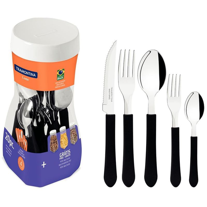 Para compor refeições práticas e uma mesa cheia de estilo a Tramontina traz o Faqueiro Leme Preto. Composto por 20 talheres com lâminas em aço inox e cabos de polipropileno, que contam com resistência e durabilidade para estarem presentes em todos os momentos do seu dia a dia. As peças são práticas e fáceis de manusear com cabos em formato anatômico que se encaixam perfeitamente na mão. Acompanha ainda um pote multiuso ideal para organizar os talheres ou, se preferir, para armazenar alimentos e outros itens na cozinha.