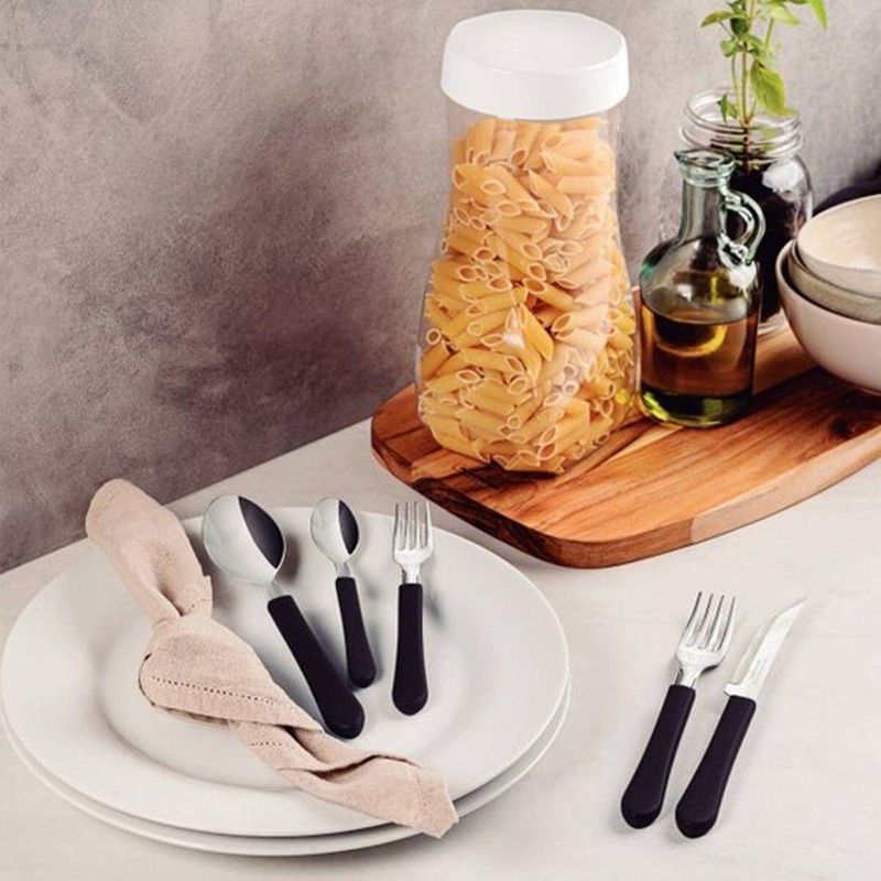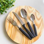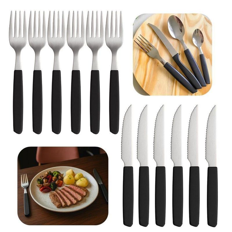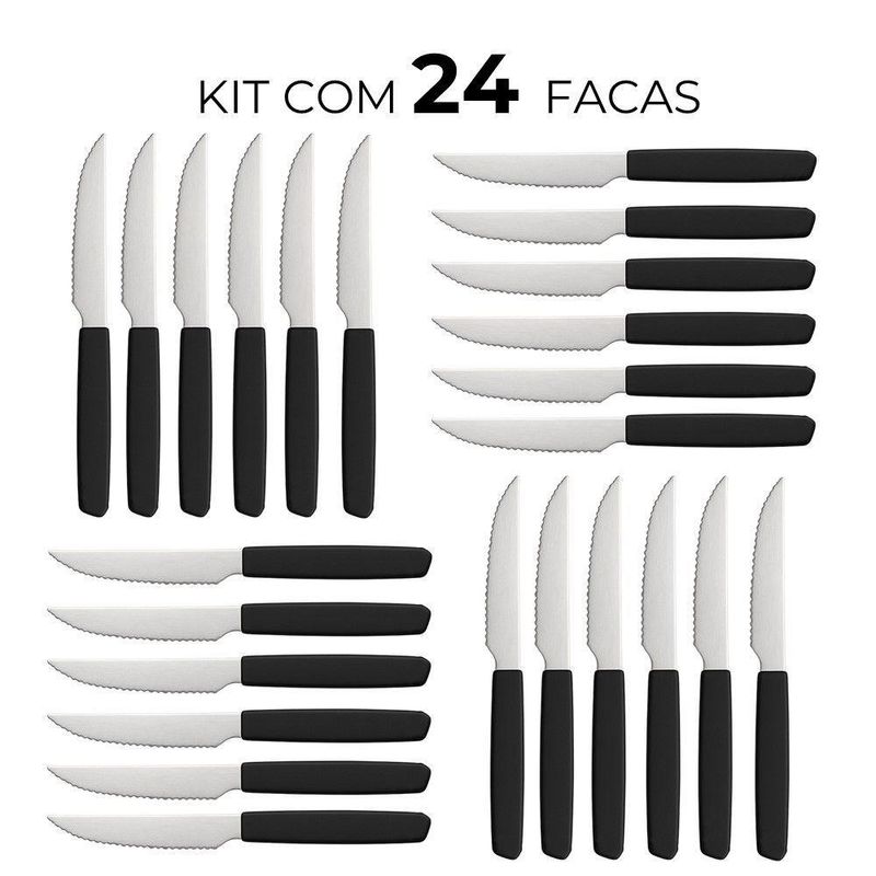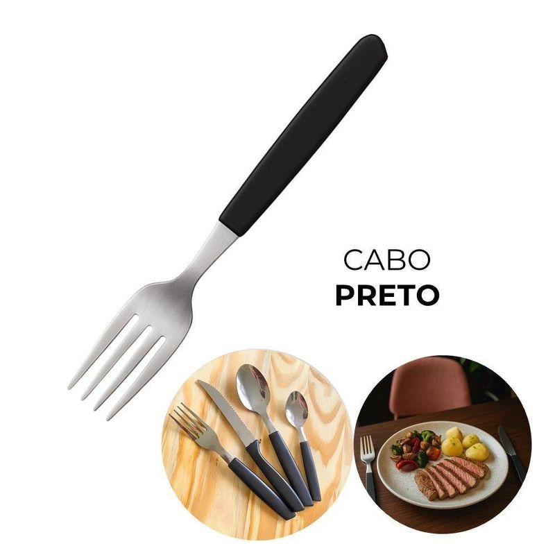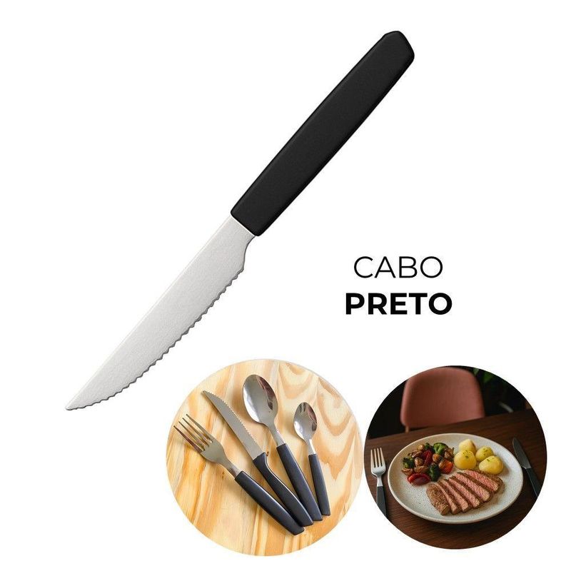 Faqueiro 24 Peças 12 Garfos 12 Facas Cabo Preto De Plástico Berlin Em Casa TemFaqueiro 24 Peças 12 Garfos 12 Facas Cabo Preto de Plástico Berlin Em Casa TemO kit vem com:12 Garfos e 12 FacasConjunto de garfos e facas para diferentes necessidades na cozinha, oferecendo versatilidade no preparo de alimentos. As lâminas são fabricadas em aço inoxidável, o que garante resistência à corrosão e maior durabilidade do fio de corte. Os cabos emborrachados proporcionam um manuseio firme e seguro, mesmo com as mãos molhadas.O design equilibrado das facas contribui para o conforto durante o uso prolongado. O conjunto inclui diferentes tipos de facas, cada uma projetada para uma função específica, como cortar carne, legumes, pães e outros alimentos. O acabamento preto confere um visual discreto e moderno, integrando-se facilmente a diferentes estilos de cozinha.Benefícios funcionais:- Aço inoxidável: Resistência à oxidação, prolongando a vida útil das lâminas.- Cabos emborrachados: Aumentam a segurança no manuseio, evitando escorregões.- Design balanceado: Reduz a fadiga durante o uso contínuo.- Variedade de facas: Atende a diversas necessidades no preparo de alimentos.Conteúdo do Kit:Jogo de 6 Garfos Cabo Preto de Plástico Berlim 20cm Em Casa TemCódigo: 127039Marca: EmCasaTemMaterial: Plástico e açoDimensões do produto (AxLxC): 20,00x2,00x2,00cm cada unidadeQuantidade: 2 unidadesJogo de 6 Facas Cabo Preto de Plástico Berlim 20cm Em Casa TemCódigo: 127037Marca: EmCasaTemMaterial: Plástico e açoDimensões do produto (AxLxC): 20,00x2,00x2,00cm cada unidadeQuantidade: 2 unidades