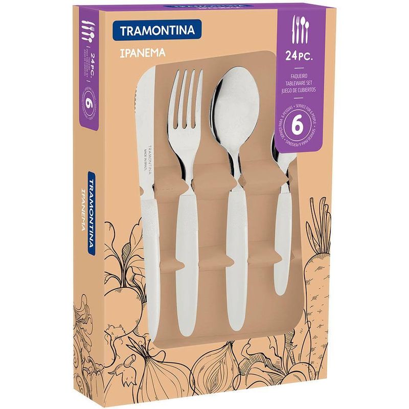 Praticidade e qualidade para suas refeições com esse incrível Faqueiro 24 Peças Ipanema da Tramontina!Com um design prático e moderno, os talheres desse conjunto são perfeitos para complementar a decoração de sua mesa! Com ele, seus almoços e jantares ficarão muito mais atraentes, atiçando o paladar e deixando qualquer receita mais saborosa!O Faqueiro Ipanema conta com a qualidade já reconhecida da Tramontina, pois as lâminas em aço inox das facas possuem maior durabilidade do fio devido ao tratamento térmico, e os garfos e colheres contam com maior espessura e uma estampagem do aço que garante maior resistência, evitando deformações. Além disso, os cabos em Polipropileno são super resistentes e possuem um desenho especialmente pensado para garantir conforto no manuseio, encaixando perfeitamente nas mãos.