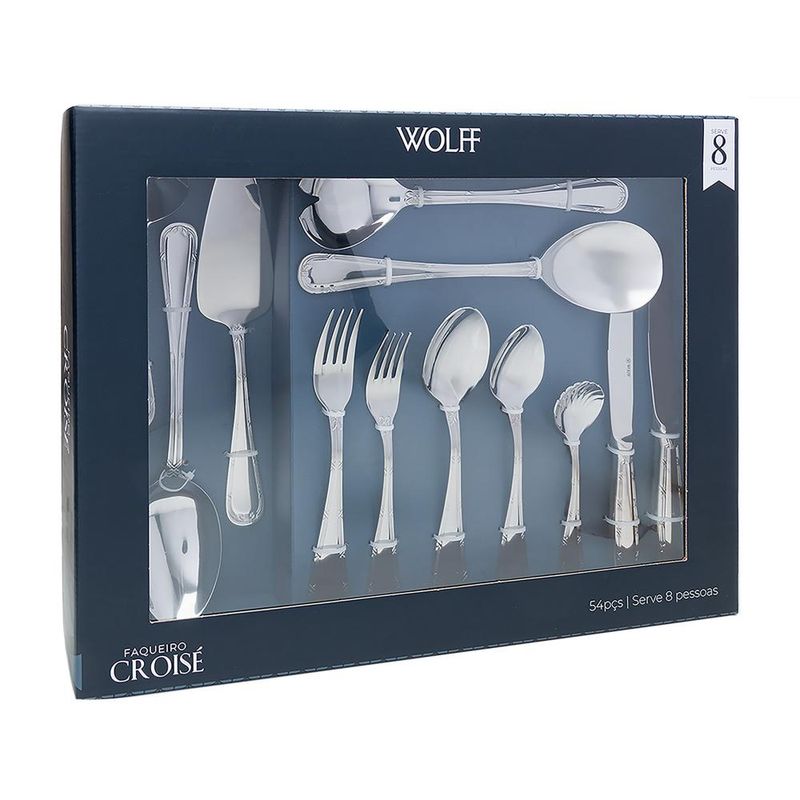 Faqueiro 54 Peças Croisé com Caixa Litografada Aço Inox Contém: 8 facas de mesa 24x2x1cm8 colheres de mesa (sopa) 20x4,5x3cm8 garfos de mesa 20x2,5x2,5cm8 facas de sobremesa 22x2x1cm8 colheres de sobremesa 18x4x2cm8 garfos de sobremesa 18,5x2x2cm1 colher de açúcar 14x3,5x2cm1 colher de salada 24x6x3cm1 garfo de salada 24x6x2,5cm1 colher de servir 25x6x4cm1 concha para molho 20x6x4cm1 espátula de bolo 24,5x5,5x2,5cmMedidas Produto: Altura 1,00cm x Largura 1,00cm x Comprimento 1,00cmPeso: 1,00Kg