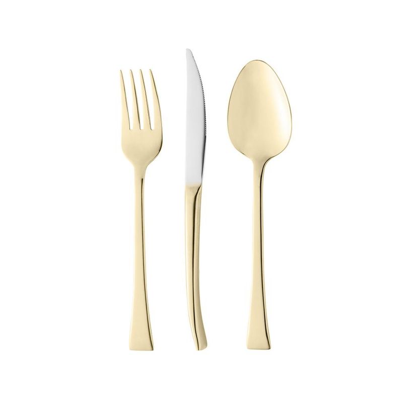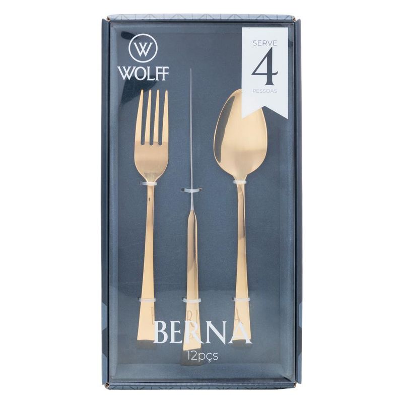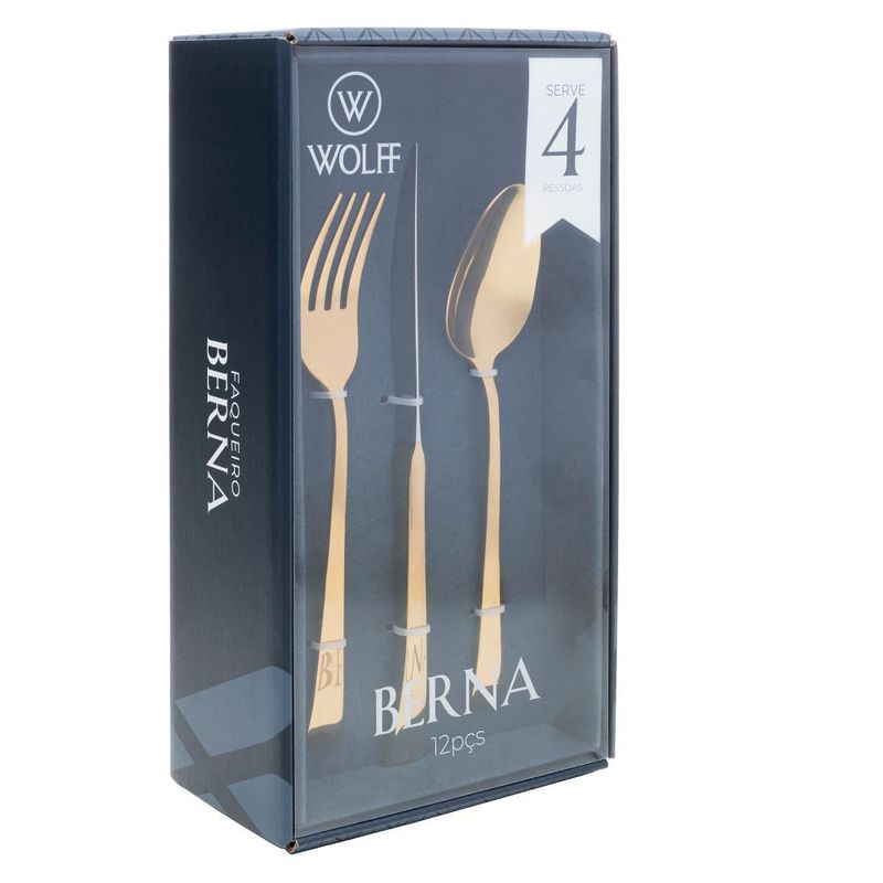 Faqueiro Berna 12 Peças Dourado Aço Inox WolffO toque de ouro que transforma sua mesa. O faqueiro Berna dourado une o brilho sofisticado ao design funcional, criando uma atmosfera de celebração em qualquer ocasião.O toque de ouro que transforma sua mesa. O faqueiro Berna dourado une o brilho sofisticado ao design funcional, criando uma atmosfera de celebração em qualquer ocasião.• Aço inox douradoelegância e resistência em uma só peça.• Acabamento premiumbrilho duradouro e alta qualidade.• Composição versátilperfeito para jantares especiais ou para elevar o dia a dia.• Design atemporaladapta-se a estilos clássicos e modernos.Sirva com arte. A Wolff traz tradição e inovação para a sua mesa.Contém: 4 Colheres para Mesa 20x4x2cm4 Garfos para Mesa 20x2,5x2cm4 Facas para Mesa 23x2x2cmMedidas Produto: Altura 6,00cm x Largura 14,00cm x Comprimento 27,00cmPeso: 0,82KgLavar com detergente neutro, esponja macia e secar imediatamente.