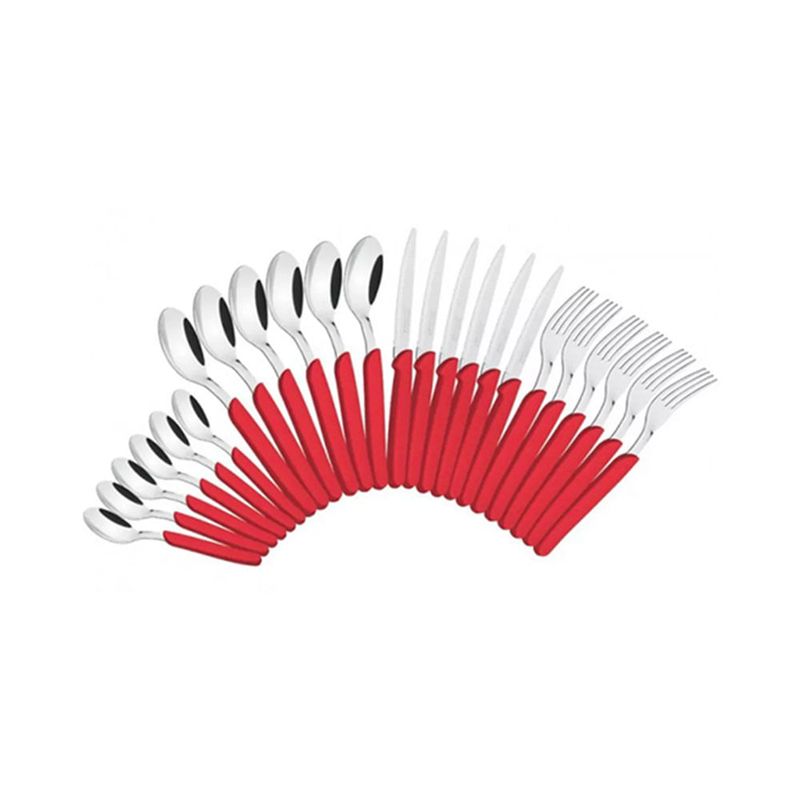 As cores da linha Carmel trazem mais alegria para a mesa, tornando qualquer ocasião em um momento super especial. Com o Faqueiro Tramontina Carmín/Médio em Aço Inox e Cabo Polipropileno com Facas para churrasco 24 Peças você poderá montar um serviço de mesa diferenciado, delicado e apaixonante. Os talheres são produzidos com lâminas em aço inox e espessura que mantém as suas formas inalteradas, mesmo com uso intenso, contando com cabos de polipropileno altamente durável. As facas têm maior durabilidade, pois as lâminas em aço inox recebem tratamento térmico. A escolha certa para quem busca por peças que levam toda a qualidade da Tramontina, sem deixar de lado a sua beleza! - Lâminas de aço inox. As lâminas das facas têm maior durabilidade do fio devido ao tratamento térmico. Os garfos e colheres garantem maior resistência devido a espessura do aço e a estampagem das lâminas; - Os cabos de polipropileno possuem maior resistência e durabilidade; - Podem ir à máquina de lavar louças facilitando seu dia a dia. Orientações Gerais: - Tenha cuidado ao manusear produtos cortantes e perfurantes e mantenha-os fora do alcance das crianças; - Para maior durabilidade dos produtos recomenda-se secar bem antes de guardar, mesmo após lavagem em máquina; - Para descarte dos produtos e embalagens siga as orientações de reciclagem vigentes. Conteúdo: 06un. Facas para Churrasco 4" Carmel; 06un. Garfos de Mesa Carmel; 06un. Colheres de Mesa Carmel; 06un. Colheres para Chá Carmel. Características: Cor: Carmín/Médio; Fabricante: Tramontina.
