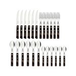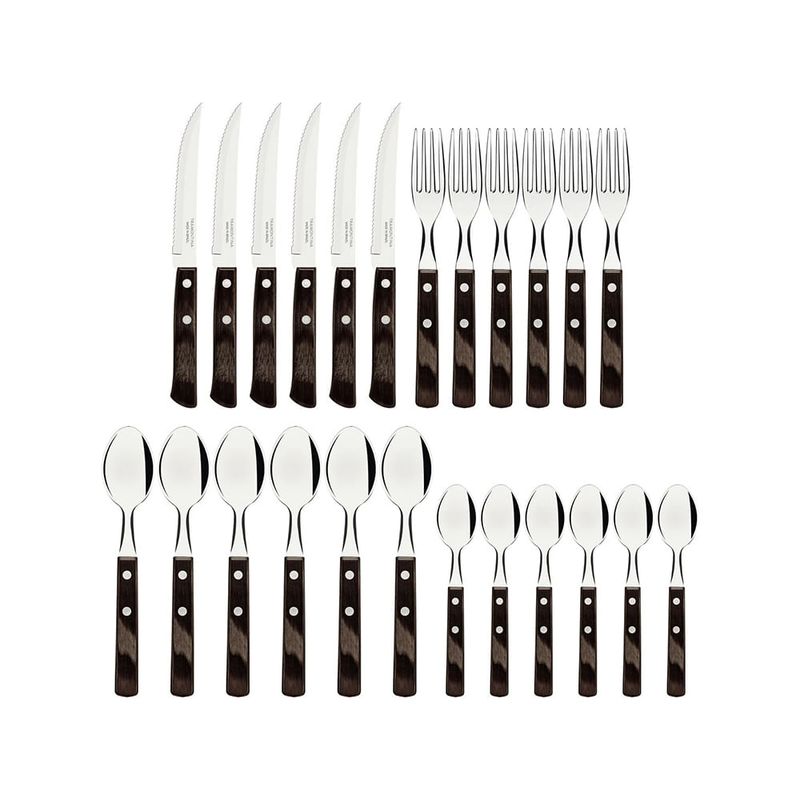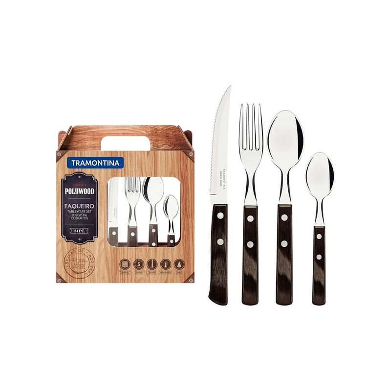 Faqueiro Inox 24 Peças Polywood Castanho - TramontinaUma mesa elegante e completaO Faqueiro Tramontina Polywood com lâminas em aço inox e cabos de madeira tratada castanho é a escolha ideal para quem busca beleza, qualidade e durabilidade na hora de servir à mesa. Composto por 24 peças, este faqueiro traz um toque especial para suas refeições, seja em ocasiões informais ou momentos especiais.Diferenciais do Produto:Lâminas em aço inox: garantem durabilidade e resistência às peças.Cabos de madeira tratada Polywood: resistentes ao tempo, à umidade e impactos, proporcionando um design diferenciado e elegante.Versatilidade: ideal para diversas ocasiões, do dia a dia a eventos especiais.Praticidade: conjunto completo com facas, garfos e colheres para atender todas as necessidades à mesa.Funcionalidades e Dicas de Uso:O Faqueiro Inox 24 Peças Polywood Castanho Tramontina é perfeito para embelezar seus momentos à mesa. Para conservar a beleza e qualidade das peças, recomenda-se lavar à mão com sabão neutro e secar bem antes de guardar. Evite o uso de produtos abrasivos que possam danificar o aço inox e a madeira. Utilize o faqueiro em diversas ocasiões e impressione seus convidados com a elegância e sofisticação deste conjunto.Ficha Técnica:Marca: TramontinaMaterial: Aço inox e madeira tratada PolywoodQuantidade de Peças: 24Cor: CastanhoDimensões aproximadas da embalagem (AxLxP): 5 x 30 x 25 cmPeso aproximado: 1,5 kg