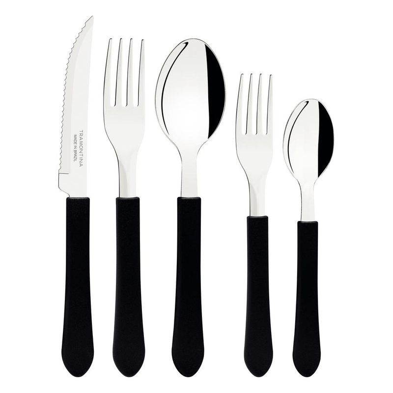 Faqueiro Talheres Leme Inox 40 Peças Tramontina Preto Deixe sua mesa muito mais bonita e cheia de estilo com o faqueiro Tramontina Leme com lâminas em aço inox e cabos de polipropileno 40 peças! Perfeito para uso diário, ele tem peças produzidas com lâminas em aço inox com resistência e durabilidade devido ao tratamento térmico e a espessura. Os cabos são em polipropileno e proporcionam um manuseio superconfortável, além de deixar a composição da sua mesa muito mais elegante, devido a cor cinza. O faqueiro ainda é muito fácil de limpar e poder ser levado à máquina de lavar louças, facilitando suas tarefas na cozinha. Com a Tramontina, você tem os melhores talheres para sua casa! Contém: 8 facas para churrasco, 8 garfos de mesa, 8 colheres de mesa, 8 garfos de sobremesa e 8 colheres para chá Descrição do produtoCor: PretoMarca: TramontinaQuantidade de Peças: 40Serviço: Até 8 pessoasLinha Comercial: Faqueiros e TalheresvLemeMaterial Cabo: PolipropilenoMaterial Lâmina: Aço inoxAltura: 25cmLargura: 10 cmComprimento: 10cmPeso: 1,2kg Imagens meramente ilustrativas, todos os itens que ambientam o produto não estão inclusos.