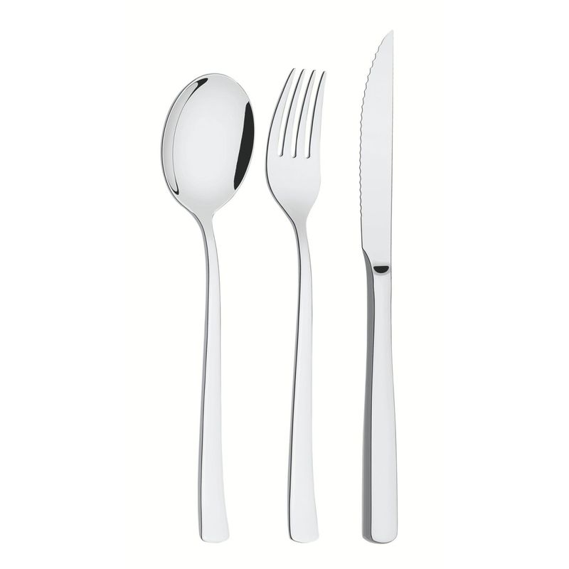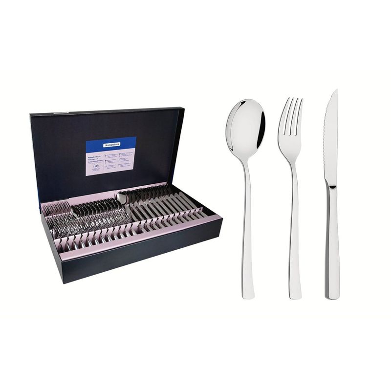 Faqueiro Tramontina Berlin 72 Peças Brilho Aço Inox Facas Churrasco Forjada Alto Brilho Tramontina - Faqueiro Tramontina Berlin 72 Peças Brilho Aço Inox Facas para Churrasco Forjada Alto Brilho Todo bom churrasco precisa de facas de qualidade. Com o Faqueiro Tramontina em Aço Inox com Facas para Churrasco Forjada Acabamento Alto Brilho 72 Peças da linha Berlin Brilho, você poderá apreciar ainda mais os momentos. As peças são produzidas em aço inox e altamente duráveis, o conjunto oferece um serviço para até 12 pessoas, contando com colheres com bojo em formato simétrico e bordas cuidadosamente arredondadas. Garfos com dentes polidos na parte interna, com formato apropriado para a boca e bordas arredondadas para proporcionar maior conforto no uso. Facas totalmente temperadas, que garantem maior durabilidade no fio de corte serrilhado e maior resistência à corrosão, e por suas caracterÃsticas de temperabilidade, não riscam as porcelanas. Seu acabamento em alto brilho proporcionara ainda mais beleza para o momento. As peças são acondicionadas em uma bela embalagem. Totalmente feitas de aço inox, altamente duráveis, mantêm suas caracterÃsticas originais, preservando a beleza, a higiene e a durabilidade do material. Colheres com bojo em formato simétrico ebordas cuidadosamente arredondadas. Garfos com dentes polidos na parte interna, com formato apropriado para a boca e bordas arredondadas para proporcionar maior conforto no uso. Facas totalmente temperadas, que garantem maior durabilidade no fio de corte e maior resistência à corrosão, e por suas caracterÃsticas de temperabilidade, não riscam as porcelanas. Acabamento em alto brilho. Serviço para 12 pessoas. Podem ser lavadas diariamente na máquina de lavar louças. Cuidados com o produto Use apenas sabão ou detergente e uma esponja macia. Outros tipos de produtos, como palha de aço, poderão riscar ou prejudicar o brilho dos talheres. Enxágue bem cada peça a fim de remover totalmente os resÃduos dos produtos de limpeza, que, por serem abrasivos, podem atacar o inox. Sempre que possÃvel, use água quente, pois renova o brilho do talher. Após a lavagem, enxugue imediatamente os talheres, caso contrário, as substâncias quÃmicas da água (cloro) poderão causar manchas. Evite atrito entre os talheres durante o processo de lavagem e no armazenamento, para mantê-los sem riscos. Evite o contato das peças com superfÃcies quentes. Elas provocam a descoloração do produto. Não guarde os talheres em locais úmidos. A umidade também provoca manchas.Qualquer faca, independentemente de marca, para manter o fio de corte, é fabricada em aço com maior teor de carbono e, por isso, é menos resistente à corrosão. Assim, pedimos uma atenção especial para este artigo, pois estará mais propenso aos problemas citados. Usando máquina de lavar louças: Não carregue em demasia a cesta dos talheres. Separe bem as peças, pois o contato permanente entre as mesmas, durante a secagem, poderá causar manchas. Retire os talheres logo que tenha terminado o ciclo "enxaguar", a fim de que os mesmos sejam secados manualmente. Garantia 90 dias de garantia legal para vÃcios ou defeitos de fabricação. Características Gerais do Produto: Garantia: • 90 dias de garantia legal para vícios ou defeitos de fabricação.