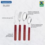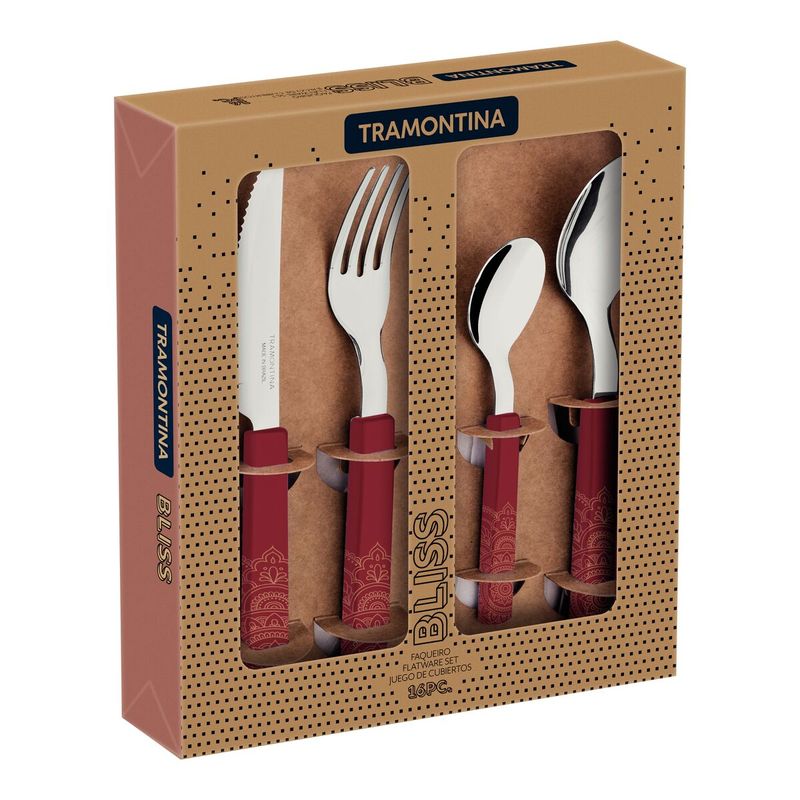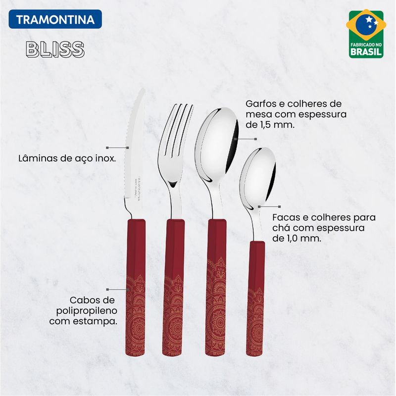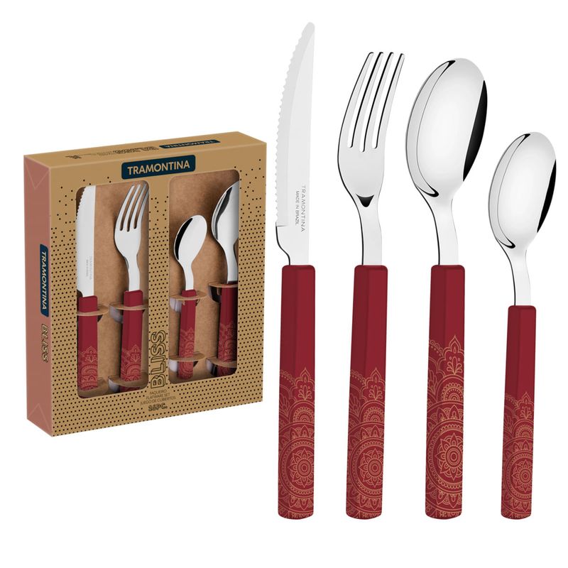 Deixe a composição da sua mesa impecável e cheia de estilo com o faqueiro Tramontina Bliss com lâminas em aço inox e cabos de polipropileno carmim 16 peças. Suas peças são produzidas com lâminas de aço inox, espessura e tratamento térmico que proporcionam maior resistência, durabilidade aos garfos e colheres e um excelente fio de corte às facas. Os cabos são em polipropileno na cor carmim e possuem uma linda serigrafia de mandalas, perfeita para agregar muito mais charme e beleza às suas refeições. Escolha os talheres Tramontina e veja sua mesa transformada!