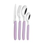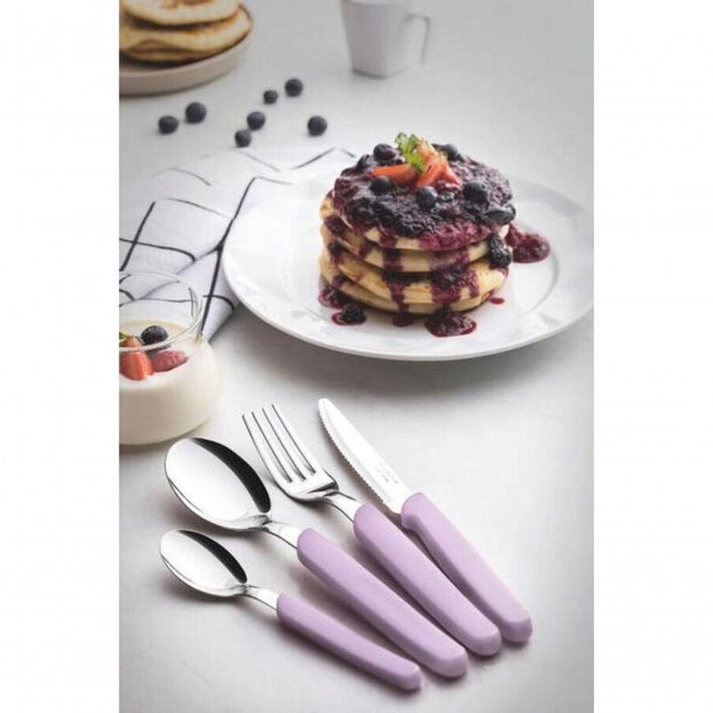 Faqueiro Tramontina Carmel 24 Peças Púpura ClaroTalher para vestir a mesa e combinar com vários estilos de porcelana. Cores que inspiram sabores para todos os momentos.Recomendações de Uso:Modo de uso: antes da primeira utilização, remova as eventuais etiquetas e lave usando apenas uma esponja macia, sabão ou detergente neutro. Outros tipos de produtos, como palha de aço, poderão riscar ou prejudicar o acabamento da peça. Enxágue cada item a fim de remover totalmente os resíduos dos produtos de limpeza, que, por serem abrasivos, podem danificar o inox. Após a lavagem enxaguar e secar bem a peça, caso contrário, as substâncias químicas da água (cloro) poderão causar manchas. Para maior durabilidade dos produtos recomenda-se secar bem antes de guardar, mesmo após lavagem em máquina. Evite o contato direto da peça com superfícies quentes, pois poderá provocar deformações ao produto. Evite atrito entre as peças durante o processo de lavagem e no armazenamento, para mantê-la sem riscos.- Tenha cuidado ao Manusear produtos cortantes e perfurantes e mantenha-os fora do alcance de crianças.- Foto meramente ilustrativa.Informações Adicionais:- Facas: lâminas com maior durabilidade do fio devido ao tratamento térmico.- Garfos, colheres e colheres para chá: a espessura do aço e a estampagem das lâminas garantem maior resistência aos produtos, evitando deformações.- Cabos de polipropileno,têm muito mais resistência e durabilidade.- Cores alegres e diferenciadas.- Podem ir à máquina de lavar louças.- Permanecem bonitas por muito mais tempo