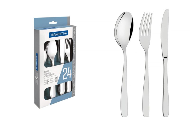 Faqueiro Tramontina Cosmos Aço Inox Facas Mesa Acabamento Brilho 24 Peças Tramontina - Tenha sempre à mão o Faqueiro Tramontina Cosmos em Aço Inox com Facas de Mesa Acabamento em Brilho 24 Peças. Essencial para servir os pratos do dia a dia, ele traz 24 peças totalmente produzidas em aço inox. Altamente duráveis, elas ainda apresentam acabamento em brilho, dando um toque charmoso para sua mesa. As colheres possuem bojo em formato simétrico e bordas cuidadosamente arredondadas. Os garfos tem dentes polidos na parte interna com formato apropriado para a boca e bordas arredondadas para proporcionar maior conforto no uso. As facas totalmente temperadas garantem maior durabilidade no fio de corte e maior resistência à corrosão. Além disso, por suas características de temperabilidade, as facas não riscam as porcelanas. Práticas, também auxiliam você na hora de limpar, podendo ser lavadas diariamente na máquina de lavar louças. Um item indispensável para servir bem! Orientações Peças totalmente feitas de aço inox, altamente duráveis, mantêm suas características originais, preservando a beleza, a higiene e a durabilidade do material. Colheres com bojo em formato simétrico e bordas cuidadosamente arredondadas. Garfos com dentes polidos na parte interna, com formato apropriado para a boca e bordas arredondadas para proporcionar maior conforto no uso. Facas totalmente temperadas, que garantem maior durabilidade no fio de corte e maior resistência à corrosão, e por suas características de temperabilidade, não riscam as porcelanas. Acabamento em brilho.Próprias para uso diário combinam com qualquer ambiente. Podem ser lavadas diariamente na máquina de lavar louças. Observações Durante a lavagem, use apenas sabão ou detergente e uma esponja macia. Outros tipos de produtos, como palha de aço, poderão riscar ou prejudicar o brilho dos talheres. Enxágue bem cada peça a fim de remover totalmente os resíduos dos produtos de limpeza, pois, por serem abrasivos, podem prejudicar o inox. Sempre que possível, use água quente, pois renova o brilho do talher. Após a lavagem, enxugue imediatamente os talheres, caso contrário, as substâncias químicas da água (cloro) poderão causar manchas. Evite atrito entre os talheres durante o processo de lavagem e no armazenamento, para mantê-los sem riscos. Evite o contato das peças com superfícies quentes. Elas provocam a descoloração do produto. Não guarde os talheres em locais úmidos. A umidade também provoca manchas. Ao usar a lava-louça, recomendamos retirar os talheres logo que tenha terminado o ciclo ''enxaguar'', a fim de que sejam secados manualmente. Características Gerais EAN13 7891116012635 DUN14 17891116012632 NCM 8215.20.00 0,8800 kg. 0,9630 kg. Metragem 0,001283 m³. 225x 148x 34 mm. Características Gerais do Produto: Garantia: • 1 Ano