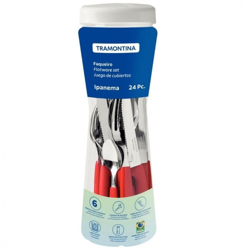 Faqueiro Tramontina Ipanema Com 24 Pecas VermelhoQuer uma solucao pratica para ter o talher certo para as mais diferentes refeicoes. Entao conheca o Faqueiro Tramontina Ipanema com Laminas em Aco Inox e Cabos de Polipropileno com Pote Plastico 24 Pecas.Um faqueiro com garfos, facas e colheres para servir da entrada a sobremesa, que tem pecas produzidas com laminas em aco inox com espessura e formatos diferenciados que garantem maior durabilidade e resistencia. Os cabos sao produzidos em polipropileno e garantem maior conforto no manuseio, alem de deixar sua mesa muito mais moderna, ele ainda acompanha um pote plastico, perfeito para armazenar suas pecas ou alimentos como macarrao ou outros graos. Com certeza, a escolha ideal para sua cozinha! Caracteristicas: Laminas de aco inox As laminas das facas tem maior durabilidade do fio devido ao tratamento termico Os garfos e colheres garantem maior resistencia devido a espessura do aco e a estampagem das laminas Os cabos de polipropileno possuem maior resistencia e durabilidade Podem ir a maquina de lavar loucas facilitando seu dia a dia Dimensoes do produto Altura: 30 cm Largura: 10 cm Profundidade: 10 cm Peso: 535 gr Garantia: 3 meses