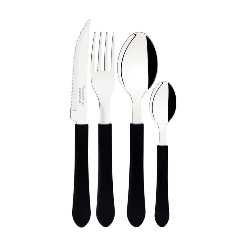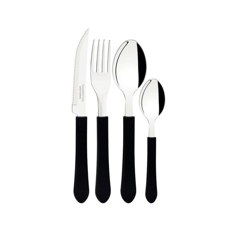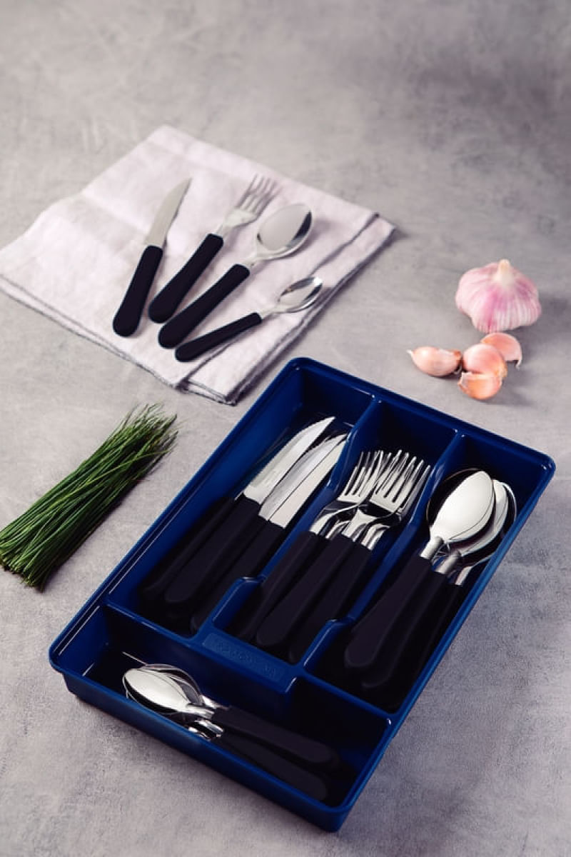 Com o Faqueiro Tramontina Leme com Lâminas em Aço Inox e Cabos de Polipropileno Preto com Gaveteiro 25 peças você irá garantir uma mesa muito mais bonita e refeições muito mais saborosas. Suas peças tem lâminas produzidas em aço inox e contam com cabos desenvolvidos em polipropileno, ambas características que proporcionam maior durabilidade e resistência. Ele vem na cor preta e deixa sua mesa muito mais moderna. É ainda muito fácil de limpar e pode ser lavado na máquina de lavar louças, além de acompanhar gaveteiro plástico ideal para armazená-lo e guardá-lo em sua gaveta. A escolha perfeita para o seu dia a dia!Descrição técnicaLâminas de aço inox. As lâminas das facas têm maior durabilidade do fio devido ao tratamento térmico. Os garfos e colheres garantem maior resistência devido a espessura do aço e a estampagem das lâminas. Os cabos de polipropileno possuem maior resistência e durabilidade. Gaveteiro ideal para armazenar e guardar os talheres na gaveta.Podem ir à máquina de lavar louças facilitando seu dia a dia.Orientação GeralAntes da primeira utilização, lave bem as peças e seque-as. Tenha cuidado ao manusear produtos cortantes e perfurantes e mantenha-os fora do alcance de crianças. Para maior durabilidade dos produtos, recomenda-se secar bem antes de guardar, mesmo após lavagem em máquina.Para descarte dos produtos e embalagens siga as orientações de reciclagem vigentes. Garantia do produto: 90 dias de garantia de acordo com o Código de Defesa do Consumidor + a Garantia do Fabricante