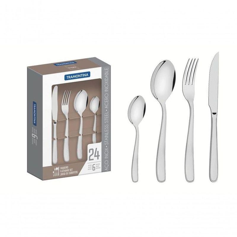 Faqueiro Tramontina Maresias Aço Inox Com Facas Para Churrasco 24 PeçasO Faqueiro Tramontina Maresias em Aço Inox com Facas para Churrasco Acabamento em Brilho 24 Peças atende as necessidades na hora de servir. São 24 peças essenciais para uma boa apresentação à mesa e para uso diário. Produzidos totalmente em aço inox, os talheres são altamente duráveis e cheios de estilo. Apresentam acabamento em brilho que embeleza sua mesa. No faqueiro você encontra garfos com dentes polidos na parte interna com formato apropriado para a boca e bordas arredondadas para proporcionar maior conforto no uso. Colheres com bojo apresentam formato simétrico e bordas cuidadosamente arredondadas. E facas totalmente temperadas, garantindo maior durabilidade no fio de corte e maior resistência à corrosão. Além disso, por suas características de temperabilidade elas não riscam as porcelanas. As peças são ainda fáceis de limpar, podendo ser lavadas diariamente na máquina de lavar louças. Um faqueiro perfeito que garante toda a qualidade dos produtos Tramontina!Recomendações de Uso:Modo de uso: ;Durante a lavagem, use apenas sabão ou detergente e uma esponja macia. Outros tipos de produtos, como palha de aço, poderão riscar ou prejudicar o brilho dos talheres. Enxágue bem cada peça a fim de remover totalmente os resíduos dos produtos de limpeza, pois, por serem abrasivos, podem prejudicar o inox. Sempre que possível, use água quente, pois renova o brilho do talher. Após a lavagem, enxugue imediatamente os talheres, caso contrário, as substâncias químicas da água (cloro) poderão causar manchas. Evite atrito entre os talheres durante o processo de lavagem e no armazenamento, para mantê-los sem riscos. Evite o das peças com superfícies quentes. Elas provocam a descoloração do produto. Não guarde os talheres em locais úmidos. A umidadetambém provoca manchas. Ao usar a lava-louça, recomendamos retirar os talheres logo que tenha terminado o ciclo ''enxaguar'', a fim de que sejam secados manualmente.- Foto meramente ilustrativa.Informações Adicionais:- Acabamento em brilho;- Peças totalmente feitas de aço inox;- Próprias para uso diário combinam com qualquer ambiente;- Podem ser lavadas diariamente na máquina de lavar louças;- Facas totalmente temperadas, que garantem maior durabilidade no fio de corte e maior resistência à corrosão, e por suas características de temperabilidade, não riscam as porcelanas.