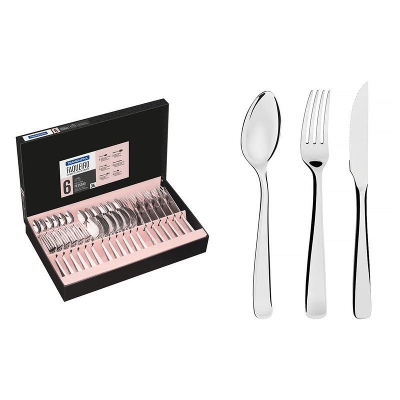 Torne suas refeições com a família e os amigos e a apreciação de um bom churrasco ainda melhor com o Faqueiro Tramontina Pacific de 36 Peças. Com serviço para 6 pessoas traz Facas para churrasco totalmente temperadas, que garantem maior durabilidade no fio de corte serrilhado e maior resistência à corrosão, colheres com bojo em formato simétrico e bordas cuidadosamente arredondadas e garfos com dentes polidos na parte interna, com formato apropriado para a boca e bordas arredondadas proporcionando maior conforto no uso. Talheres com acabamento em alto brilho com detalhes exclusivos no cabo que vão tornar cada momento especial com uma mesa muito bonita e elegante.Surpreenda seus convidados! Leve agora mesmo esse belo faqueiro!