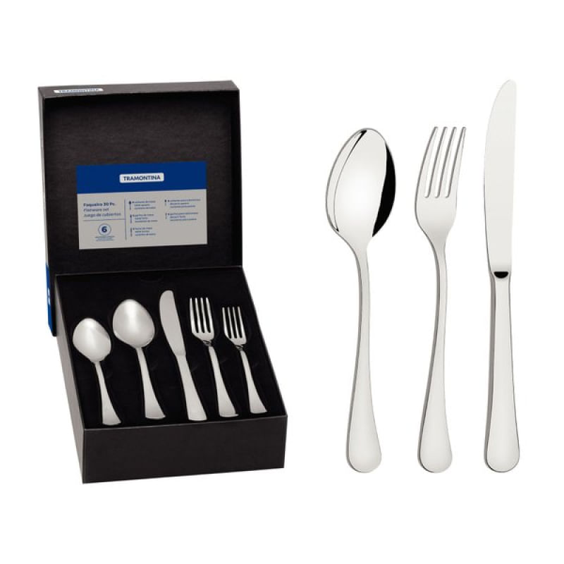 Faqueiro Tramontina Zurique Inox Facas Mesa Forjadas 30 Peças Acabamento Brilho Tramontina - Tenha os mais belos talheres no seu serviço de mesa com o Faqueiro Tramontina em Aço Inox com Facas de Mesa Forjadas Acabamento Brilho 30 Peças Peças da linha Zurique. Desenvolvido para levar elegância e sofisticação para qualquer ambiente. O conjunto conta com colheres com bojo em formato simétrico e bordas cuidadosamente arredondadas. Garfos com dentes polidos na parte interna, com formato apropriado para a boca e bordas arredondadas para proporcionar maior conforto no uso. Facas totalmente temperadas, que garantem maior durabilidade no fio de corte serrilhado e maior resistência à corrosão, e por suas características de temperabilidade, não riscam as porcelanas. Os talhares foram produzidos em aço inox, que lhe confere durabilidade, além de contar com um acabamento em alto brilho, perfeito para trazer beleza para a mesa. Características Gerais do Produto: • Cor: Inox Garantia: • 3 Meses
