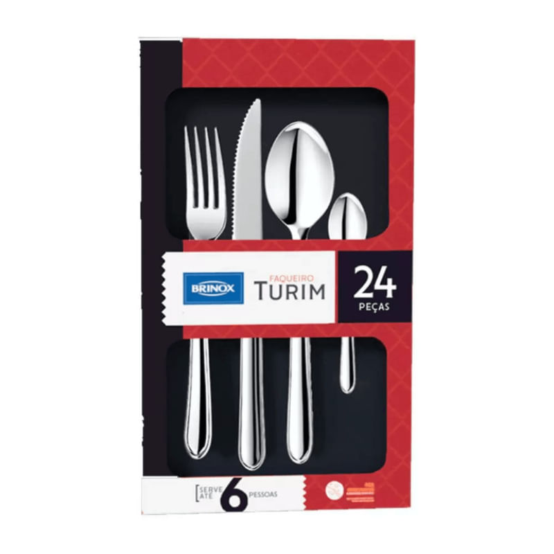 A Linha Turim é uma aliada no dia a dia. Os talheres proporcionam resistência, segurança e garantem uma rotina eficiente. Os talheres são feitos de aço inox com acabamento polido, e os cabos apresentam um friso que é marca da linha. Este faqueiro de 24 peças contém talheres para servir uma refeição para seis pessoas: colheres e garfos de mesa, facas de churrasco e colheres de chá. Todos os utensílios podem ir à lava-louças.Garantia do produto: 90 dias de garantia de acordo com o Código de Defesa do Consumidor + a Garantia do Fabricante