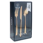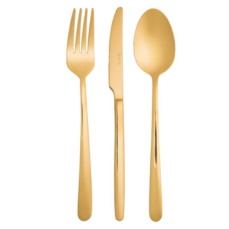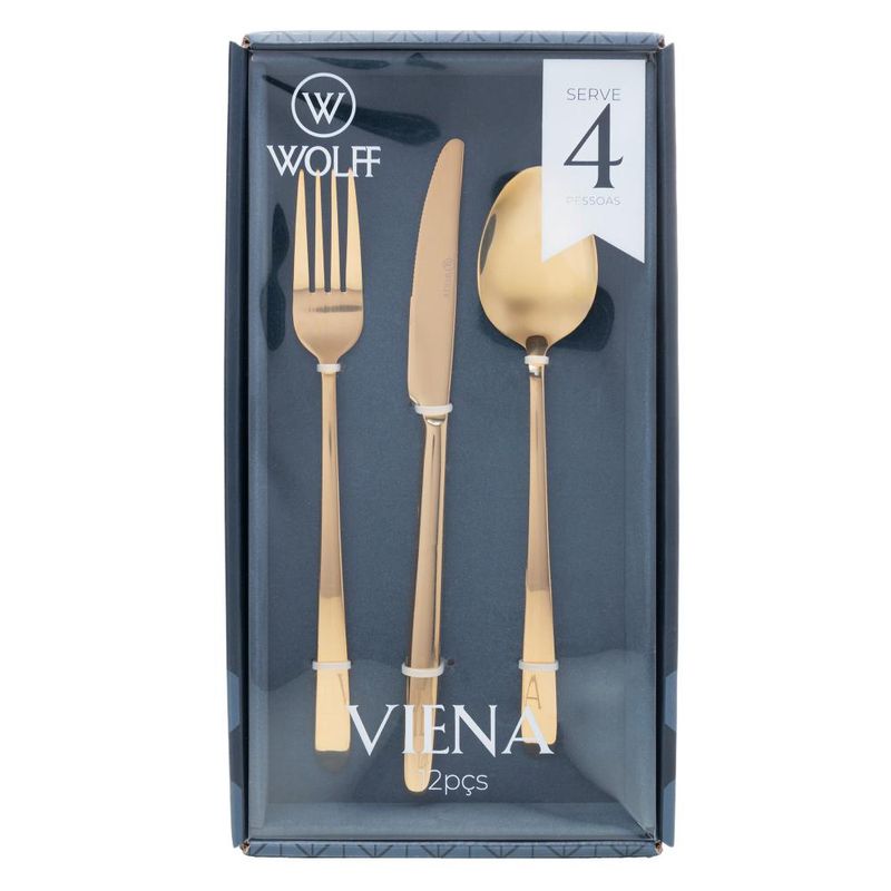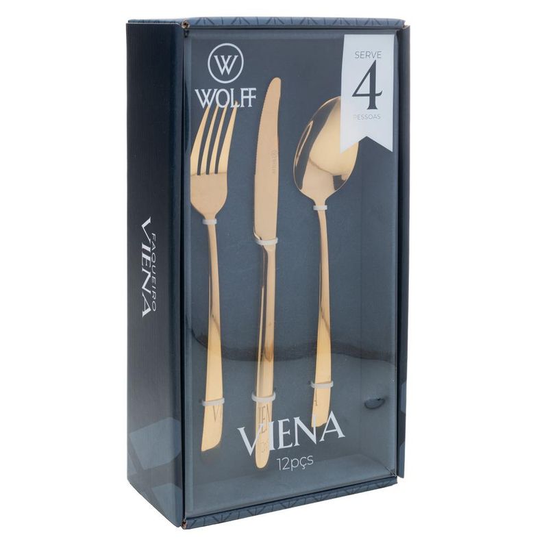 Faqueiro Viena 12 Peças Dourado Aço Inox WolffBrilho e elegância para ocasiões especiais. O faqueiro Viena dourado é a escolha certa para quem quer transformar momentos simples em experiências memoráveis.Brilho e elegância para ocasiões especiais. O faqueiro Viena dourado é a escolha certa para quem quer transformar momentos simples em experiências memoráveis.• Aço inox douradoresistência com acabamento luxuoso.• Design refinadoideal para composições clássicas e modernas.• Kit completopraticidade e elegância em todos os detalhes.• Sofisticação à mesaideal para celebrar momentos especiais.Wolfftradição, beleza e excelência em cada peça.Contém: 4 Colheres para Mesa 21x4x2,5cm4 Garfos para Mesa 21,5x2,5x2cm4 Facas para Mesa 23x2x1cmMedidas Produto: Altura 6,00cm x Largura 14,00cm x Comprimento 27,00cmPeso: 0,78KgLavar com detergente neutro, esponja macia e secar imediatamente.
