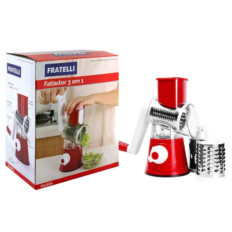 Fatiador Manual 3 em 1 Multiuso | Fratelli Com o Fatiador Manual 3 em 1 da Fratelli, agora você consegue economizar tempo e esforço no preparo de seus alimentos. Um produto bonito e compacto, acompanha 3 opções de tambores de corte (lâminas) com funções para ralar ou fatiar legumes e verduras. Além disso, é um produto seguro e fácil de manusear e lavar. Sem desculpas para uma rotina mais prática e uma alimentação mais saudável! Conteúdo da Embalagem: - 01 Fatiador 3 em 1 da Fratelli - 03 Tambores de corte (lâminas) Especificações Técnicas: Dimensões (L x A): 13 x 25 cm Composição (base): Plástico Composição (lâminas): Aço inoxidável