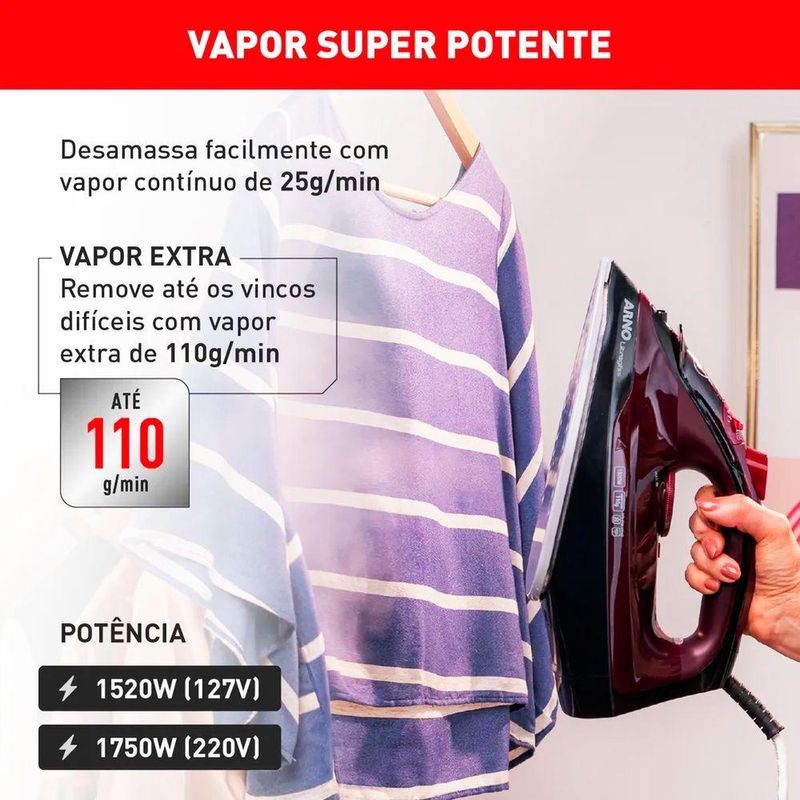 Ferro A Vapor Arno Ultragliss Com Base Durilium Airglide Fmv 220VFerro a Vapor Arno UltraglissPrático, elegante e eficiente, o Ferro a Vapor Arno Ultragliss vai tornar o serviço de passar roupas muito mais ágil e simples. O cabo possui 2 metros de comprimento, para você poder manuseá-lo com toda a liberdade possível, enquanto o reservatório dispõe de 270ml de capacidade. Porém, o portátil pode ser usado tanto a vapor quanto a seco.Base Durilium AirglideO Ferro a Vapor Arno Ultragliss é o nº1 em deslizamento, graças a base Durilium Airglide, que preserva a qualidade das roupas, deslizando rapidamente em diferentes tipos de tecidos e alcançando alto rendimento em pouco tempo. Como se não bastasse, essa base ainda é resistente a riscos e arranhões, e não deixa brilho no tecido.Vapor ExtraO Ferro Ultragliss é a combinação perfeita entre tecnologia, resistência e praticidade. Projetado com 1200W de potência, ele possui até 110g/min de vapor extra, o que significa 25% a mais de vapor e uma velocidade mais rápida de até 33%. E, para aumentar a comodidade e a facilidade, o aparelho possui sistema corta pingos, resistência a riscos e facilidade de abastecimento.Vapor verticalCom tanta tecnologia, não poderia faltar a este ferro de passar o recurso de vapor vertical, desenvolvido exclusivamente para desamassar cortinas penduradas e roupas, direto no cabide. Além disso, ele dispõe de um prático spray, que auxilia na remoção dos vincos mais difíceis e que, junto com o sistema de autolimpeza, acaba eliminando os resíduos do reservatório de água.Ultra deslizamento e potência!Com o Ferro a Vapor Arno Ultragliss você terá resultados impecáveis e um poderoso desempenho a vapor. Sua exclusiva Base Durilium Airglide FMV e Ponta de precisão, possibilitam desamassar com facilidade as áreas mais difíceis de alcançar.Ficha técnica:Código de barras: 3121040084038Marca: ArnoModelo: UltraglissVoltagem: 220V (não é bivolt)Potência (W): 1520Consumo de energia (Kw/h): 1,52Etiqueta Nacional de Eficiência Energética (ENCE): ARegistro no Inmetro: UL-BR 20.166Cor: Vinho e pretoTipo de Material: Plástico e metalTipo de plugue da tomada: 3 PinosTipo de Tomada (A): 12Comprimento do fio (M): 2Lâmpada piloto: SimVapor vertical: SimNúmero de Saídas de Vapor: 18-25g/minCapacidade do reservatório (ml): 270Seletor de intensidade de vapor: SimBase: Durilium Airglide FMVBase antiaderente: SimSpray: SimReservatório de água visível: SimPorta-fio: NãoSeletor de temperatura: SimConteúdo da embalagem: 01 ferro de passar + 01 manual de instruções + 01 certificado de garantiaDimensões do produto (LxAxP): 15,50 x 18,00 x 32,20 cmDimensões do produto embalado (LxAxP): 17,00 x 19,00 x 34,00 cmPeso líq. do produto (Kg): 1,3Peso líq. do produto embalado (kg): 1,7Garantia do fabricante: 12 mesesFabricante: ArnoImagens meramente ilustrativas.Todas as informações divulgadas são de responsabilidade do Fabricante/Fornecedor.Confira a voltagem selecionada antes de finalizar a compra.Novo Ferro a Vapor Arno Express Steam trás resultados perfeitos e maior potência de vapor graças a sua Base Dirilium Airglide Tecnologia exclusiva e sua Ponta de precisão que desamassa até áreas de dificil acesso. Possui sistema corta pingos, maior resitência a riscos e facilidade para abastecer.