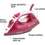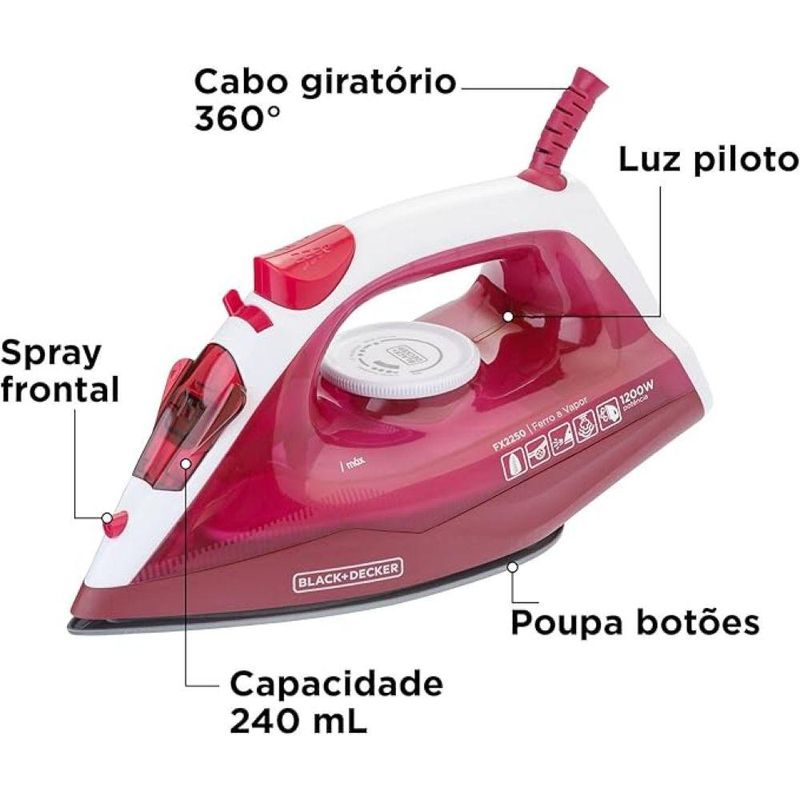 Seja bem-vindo(a) a Loja NIVALMIX,O ferro à vapor da Black+Decker é o aliado ideal para quem busca praticidade, eficiência e resultados impecáveis nas roupas do dia a dia. Com um design moderno e ergonômico, ele desliza com facilidade sobre os tecidos graças à sua base antiaderente, que evita que as roupas grudem e garante um deslizamento suave, mesmo em tecidos mais delicados.Sua potente emissão de vapor auxilia na remoção rápida dos amassados, proporcionando roupas bem passadas em menos tempo. O sistema de spray frontal ajuda a umedecer as áreas mais difíceis, facilitando o alisamento de vincos resistentes. Além disso, o controle de temperatura ajustável permite selecionar o nível ideal para cada tipo de tecido, oferecendo segurança e versatilidade no uso.Compacto e fácil de manusear, o ferro conta ainda com cabo giratório, que proporciona liberdade de movimento durante o uso, e reservatório de água transparente, facilitando o acompanhamento do nível de água.Com o ferro à vapor da Black+Decker , passar roupas se torna uma tarefa mais simples, ágil e eficaz — ideal para quem valoriza praticidade sem abrir mão de qualidade e desempenho.Especificações:• Marca: Black+Decker• Referência: FX2250-BR• Cor: Cereja (Vermelho)• Material: Resina plástica, aço alumínio, e fio de cobre.• Garantia do Fornecedor: 3 meses contra defeitos de fabricação• Capacidade: 240ml• Voltagem: 127V• Base antiaderente• Validade: Indeterminada• Selo de Segurança Inmetro• Dimensões do produto (aproximadas):18 cm de diâmetroItens Inclusos: • 01 Ferro de passar roupas• 01 Manual de instruções
