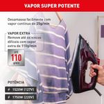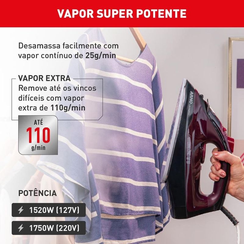 Inovação em cuidados com as roupas Descubra a inovação no cuidado das suas roupas com o Ferro de Passar a Vapor Arno Ultragliss. Projetado para transformar sua rotina de passar roupas, este ferro combina tecnologia avançada com potência superior para resultados impecáveis. Deslizamento rápido e durabilidade A base Durilium Airglide do Arno Ultragliss proporciona um deslizamento até 33% mais rápido* em comparação com a versão anterior. Além de facilitar o movimento sobre os tecidos, sua superfície é resistente a riscos e arranhões, garantindo uma durabilidade incomparável e um desempenho eficiente por mais tempo. Potência e tecnologia de vapor Com 1750W de potência, o Arno Ultragliss aquece rapidamente, permitindo que você passe roupas com mais agilidade. O vapor contínuo de até 25 g/min e o vapor extra de 110 g/min, aliado aos 67 furos ativos, oferecem uma capacidade superior de desamassar, tornando o processo mais rápido e eficiente. Resultados perfeitos O Ferro Arno Ultragliss é ideal para quem busca praticidade e eficácia. Experimente a combinação de alta potência e tecnologia de vapor para obter roupas perfeitamente passadas com menos esforço. Transforme sua rotina de cuidados com as roupas com o Arno Ultragliss e desfrute de resultados impecáveis a cada uso.
