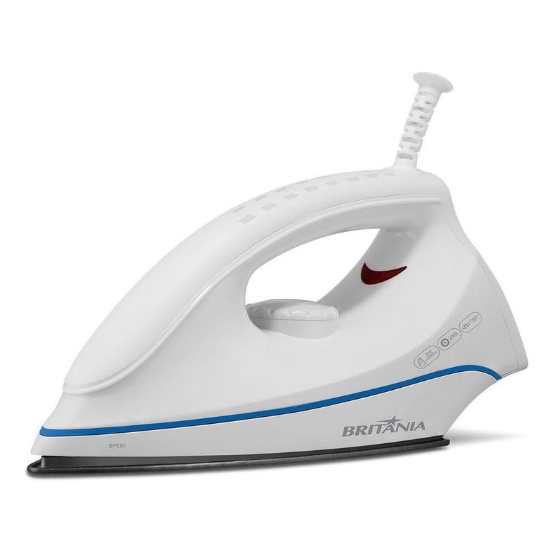 Ferro De Passar Britânia BFS30 5 Temperaturas 1250W 220VMais praticidade para quem tem uma vida corrida! O Ferro de Passar Britânia BFS30 conta com 1250W de potência, ou seja, aquece muito e rapidamente.Seu aquecimento acontece em 26 segundos e proporciona muita agilidade para passar sem atrasos. São 5 temperaturas para você escolher a ideal para cada tipo de tecido e manter o cuidado com as suas roupas! Além de possuir salva botões, que protegem os botões durante o uso do ferro de passar.Com muito mais eficiência, a temperatura máxima do Ferro de Passar BFS30 da Britânia é de 200°C. Além disso, sua base com revestimento antiaderente garante a distribuição do calor de maneira uniforme e rápida.Por possuir um cordão com 1,7m de comprimento, emborrachado e com giro de 360°, você tem mais comodidade e liberdade de movimento na hora de passar suas roupas.Ferro de Passar Britânia BFS30 5 temperaturas 1250W, um ferro compacto que se encaixa na sua rotina e no seu espaço! Principais Características- Base com revestimento antiaderente- Tempo de aquecimento de 26s- Temperatura máxima de 200°c- Cordão emborrachado- Cordão giratório- Cordão elétrico com 1,70m- Salva botões- Luz indicadora de funcionamento- 5 temperaturas- Metal e plástico.Observação: Somente faturamos para o nosso consumidor final, ou seja, não faturamos pedidos para CNPJ por este portal de vendas.Especificações TécnicasMarca: BritâniaModelo: BFS30Cor: BrancoComprimento cordão elétrico: 1,7m (metros)Estado: NovoPotência: 1250 WConsumo: 1,25 (kW/h)Material da base: AntiaderenteTipo cordão elétrico: GiratórioFunções: SecoAltura do produto: 10,2 cmLargura do produto: 27 cmComprimento do produto: 17 cmPeso do produto: 0,573 kgAltura com embalagem: 14 cmLargura com embalagem: 27 cmComprimento com embalagem: 10,5 cmPeso com embalagem: 0,664 kgGarantia: 360 Dias