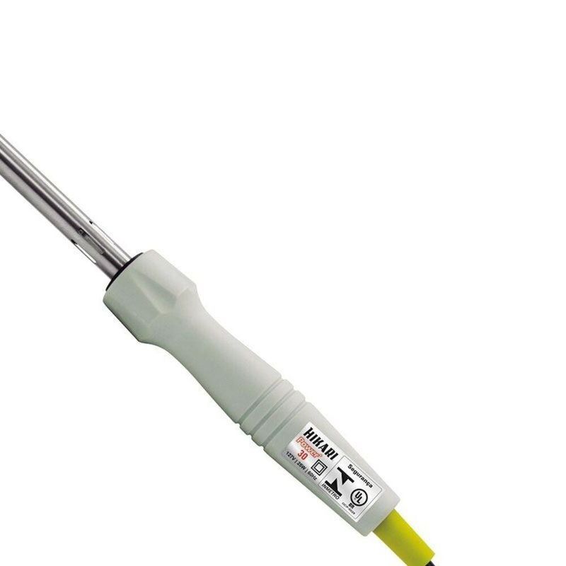 Ferro De Solda 25w 110V Power 30 Cinza/amarelo HikariCERTIFICADO PELO INMETROFácil reposiçãoTubo ventiladoPBT* AntichamaAcompanha suporte para ferroFácil reposiçãoTroca a ponta e resistência com mais facilidade.Tubo ventiladoDissipa o calor. Maior durabilidade da resistência.PBT* AntichamaEsquenta menos a empunhadura.*PBT (Politereftalato de butileno) mesmo material utilizado em: tomadas, disjuntores e conectores elétricos.Dupla IsolaçãoProtege contra choque.Potência de consumo: 25WTemperatura máxima: 410°CComprimento: 210mmPeso Total: 140gConjunto de resistência e tubo metálico substituívelResistência de micaPonta de longa durabilidade tratada com ferro e alumínioInstruções de Uso:Estanhe a extremidade da ponta ao ligá-lo pela primeira vez.Estanhe a ponta também todas as vezes que desligar o ferro para evitar oxidação.Este procedimento aumenta consideravelmente a vida útil da ponta.Os ferros de soldar devem ser colocados em suporte adequado quando não estiverem sendo usados.Como Soldar:Primeiro lixe toda sujeira, ferrugem ou tinta da área a ser soldada.Depois:Aqueça o local com ferro de soldar.Aplique a solda na parte a ser soldada.