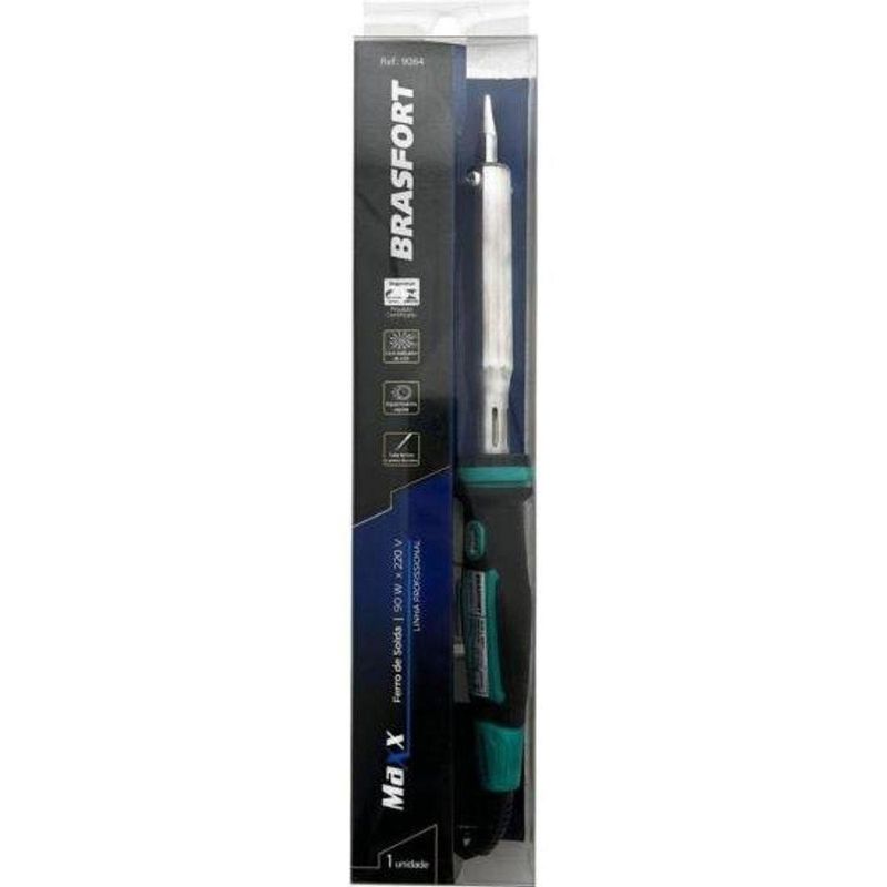 Ferro De Solda Maxx 90w 220v BrasfortO Ferro de Solda Maxx é um modelo que faz parte da linha profissional Brasfort. Oferecendo aquecimento rápido, alta durabilidade, com divisão entre ferro e empenhadura em baquelite, o ferro de solda Maxx proporciona máxima proteção térmica. A ponta de cobre anticorrosão e a resistência de cerâmica garantem um desempenho eficiente e prolongado, além disso, este modelo acompanha suporte de apoio e tubo em aço inoxidável, garantindo robustez e segurança, ideal para uso profissional.Potência:90wVoltagem:220vPesquisa:ferros de soldagem|ferro solda|solda|ferro brasfort|brasfort|maxx|soldagem|ferro de solda maxx|220v|90wO Ferro de Solda Maxx é um modelo que faz parte da linha profissional Brasfort. Oferecendo aquecimento rápido, alta durabilidade, com divisão entre ferro e empenhadura em baquelite, o ferro de solda Maxx proporciona máxima proteção térmica. A ponta de cobre anticorrosão e a resistência de cerâmica garantem um desempenho eficiente e prolongado, além disso, este modelo acompanha suporte de apoio e tubo em aço inoxidável, garantindo robustez e segurança, ideal para uso profissional.Potência:90wVoltagem:220vPesquisa:ferros de soldagem|ferro solda|solda|ferro brasfort|brasfort|maxx|soldagem|ferro de solda maxx|220v|90w