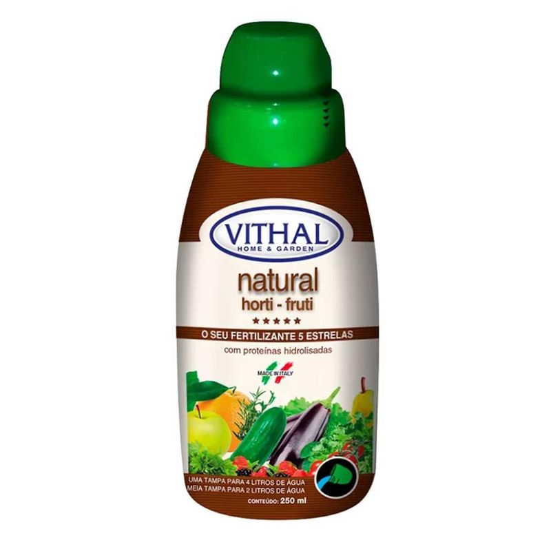 Fertilizante Líquido Natural Para Horti Fruti Vithal - 250ml Fertilizante líquido Natural ideal para hortas e frutíferas com alto teor de proteínas de origem vegetal (importante fonte de energia para o crescimento). Floração prolongada e maior frutificação Como usar Aplicar semanalmente no período de maior desenvolvimento vegetativo da planta e, mensalmente, no período de outono e inverno. Após a diluição do produto em água, aplique no solo com o auxílio de um borrifador ou regador. Composição NPK Proteínas Hidrolisadas Dose 10 ml do produto em 1 litro de água ou 1 tampa dosadora para 4 litros de água. Formulação Líquida