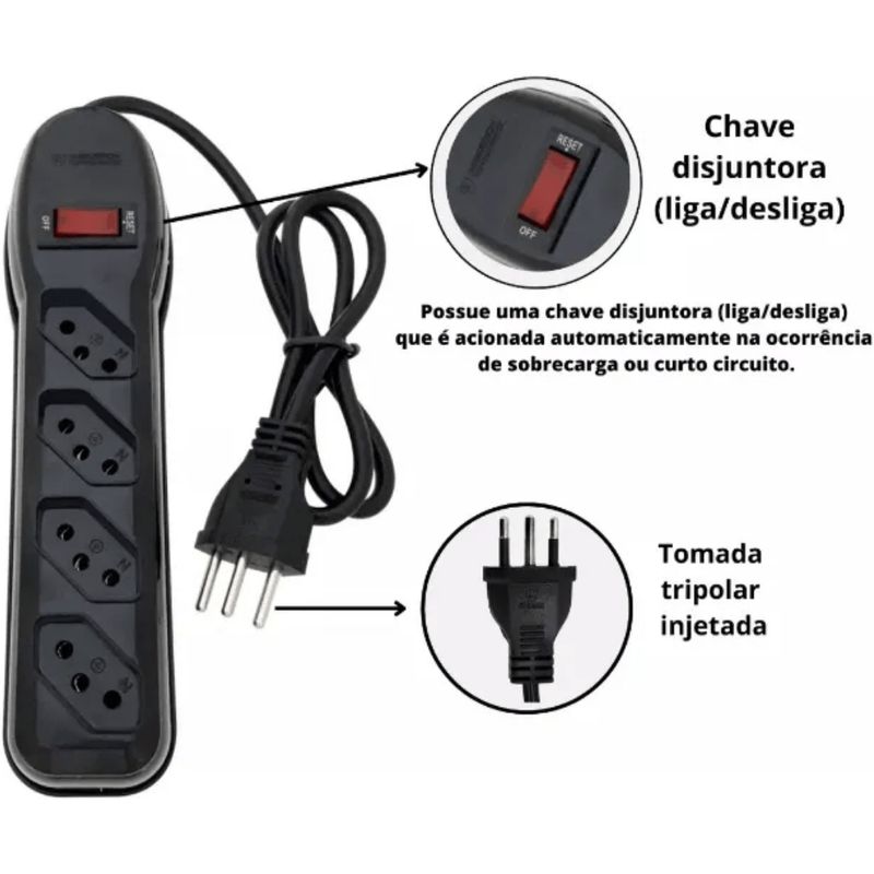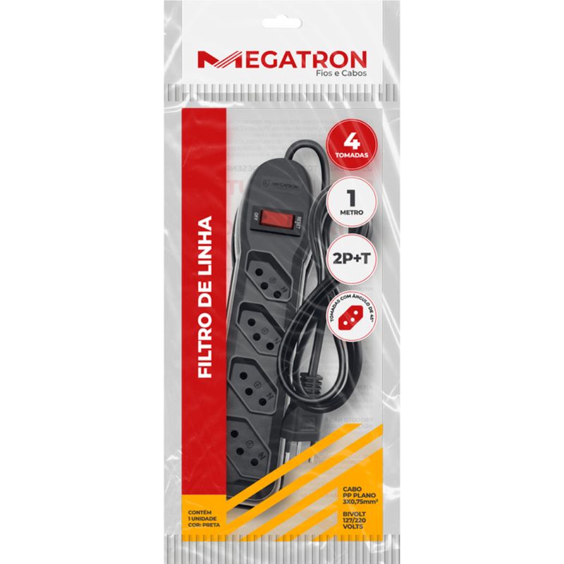 Filtro de Linha 4 Tomadas 3 Pinos Circuit Breaker 1m Preto Megatron: segurança e praticidade para seu ambiente. Com 4 tomadas tripolares injetadas, este filtro oferece conexão estável e segura para seus equipamentos elétricos. Seu cabo PP plano de 1 metro facilita o posicionamento, garantindo organização e evitando emaranhados. O diferencial está na chave disjuntora integrada, que desliga automaticamente em casos de sobrecarga ou curto-circuito, prevenindo danos e garantindo proteção total. Ideal para uso residencial e profissional, suporta bivolt (127/220V) com eficiência comprovada. Conecte seus aparelhos com confiança e aumente a durabilidade dos seus eletrônicos. Benefícios principais: - 4 tomadas tripolares 3 pinos para múltiplos dispositivos - Chave disjuntora (liga/desliga) com proteção automática - Cabo PP plano 1 metro, flexível e resistente - Compatível com bivolt 127/220V - Design compacto e cor preta para ambientes variados Garanta já um filtro de linha confiável que une proteção, durabilidade e comodidade para seu dia a dia.