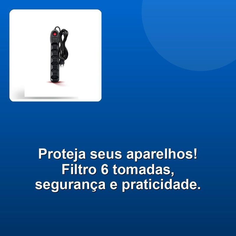 Filtro De Linha 6 Tomadas Pp 3x0,75 3m 255 PretoQuer proteger seus equipamentos eletrônicos de surpresas desagradáveis como curtos-circuitos e sobrecargas? Apresentamos o Filtro de Linha Megatron, seu aliado para uma experiência tecnológica segura e confiável!Com 6 tomadas e 3 metros de cabo PP resistente, o Filtro de Linha Megatron oferece ampla capacidade de conexão e flexibilidade para você organizar seu ambiente. Sua amperagem de 10A é ideal para suportar a demanda dos seus dispositivos eletrônicos mais potentes, como televisores, videogames, computadores e impressoras.Projetado para funcionar em redes de 110V e 220V, o Filtro de Linha Megatron se adapta a qualquer voltagem. Mas o diferencial real está em sua tecnologia integrada: o fusível que se aciona automaticamente em caso de sobrecarga ou curto circuito. Essa proteção inteligente evita danos aos seus equipamentos e garante a segurança da sua instalação elétrica.Aproveite a proteção completa e a praticidade que o Filtro de Linha Megatron oferece para manter os seus dispositivos funcionando perfeitamente. Conecte, utilize e tenha a tranquilidade de saber que seus investimentos estão sempre protegidos.Quer proteger seus equipamentos eletrônicos de surpresas desagradáveis como curtos-circuitos e sobrecargas? Apresentamos o Filtro de Linha Megatron, seu aliado para uma experiência tecnológica segura e confiável!Com 6 tomadas e 3 metros de cabo PP resistente, o Filtro de Linha Megatron oferece ampla capacidade de conexão e flexibilidade para você organizar seu ambiente. Sua amperagem de 10A é ideal para suportar a demanda dos seus dispositivos eletrônicos mais potentes, como televisores, videogames, computadores e impressoras.Projetado para funcionar em redes de 110V e 220V, o Filtro de Linha Megatron se adapta a qualquer voltagem. Mas o diferencial real está em sua tecnologia integrada: o fusível que se aciona automaticamente em caso de sobrecarga ou curto circuito. Essa proteção inteligente evita danos aos seus equipamentos e garante a segurança da sua instalação elétrica.Aproveite a proteção completa e a praticidade que o Filtro de Linha Megatron oferece para manter os seus dispositivos funcionando perfeitamente. Conecte, utilize e tenha a tranquilidade de saber que seus investimentos estão sempre protegidos.
