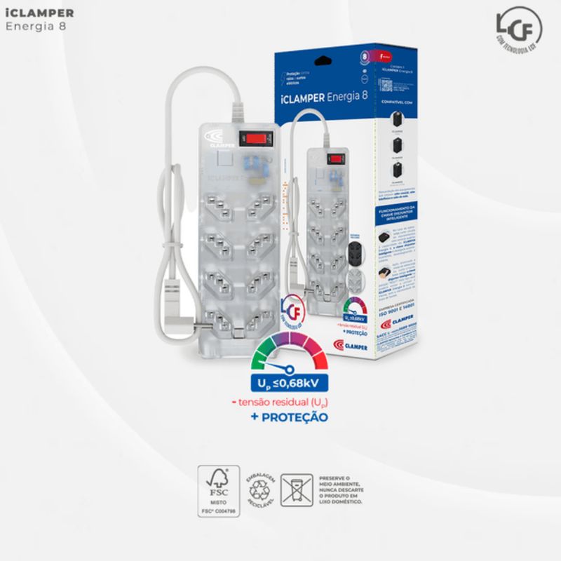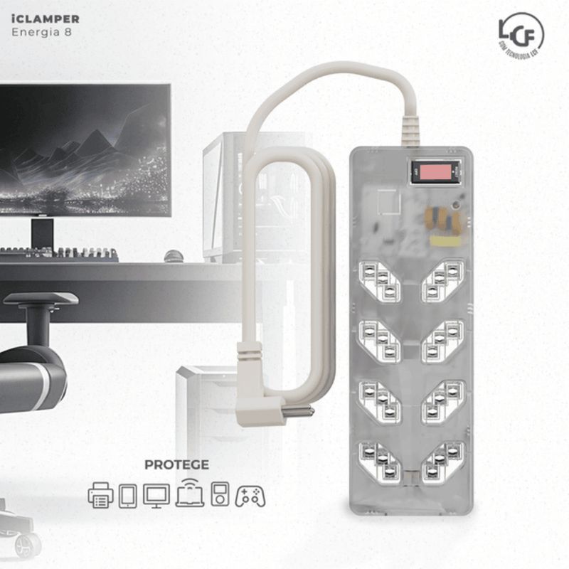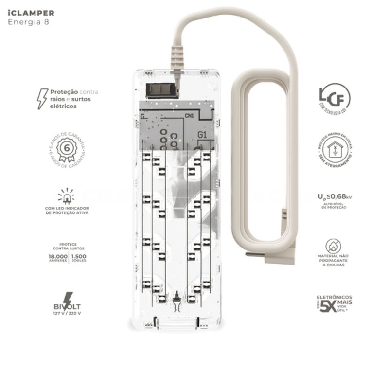 Filtro De Linha iCLAMPER Energia 8 Tomadas LCF Transparente: proteção avançada contra surtos e picos de energia para seus eletrônicos. Com 8 tomadas espaçadas, permite conectar múltiplos dispositivos com segurança, ideal para residências e escritórios. Seu design transparente une tecnologia e estética, facilitando a visualização dos componentes internos. - Proteção eficaz contra raios e surtos elétricos de até 18.000 amperes e 1.500 joules. - LED indicador que sinaliza a proteção ativa, garantindo segurança em tempo real. - Material resistente e não propagante a chamas, aumentando a durabilidade. - Bivolt automático (127 V / 220 V), compatível com diversas redes elétricas. - Tecnologia que prolonga a vida útil dos aparelhos em até 5 vezes. - Garantia de 6 anos, assegurando confiabilidade a longo prazo. Seja para proteger computadores, TVs, ou outros equipamentos sensíveis, este filtro de linha é essencial para manter seu patrimônio seguro e funcionando perfeitamente. Não arrisque seus eletrônicos: escolha qualidade e segurança comprovadas.