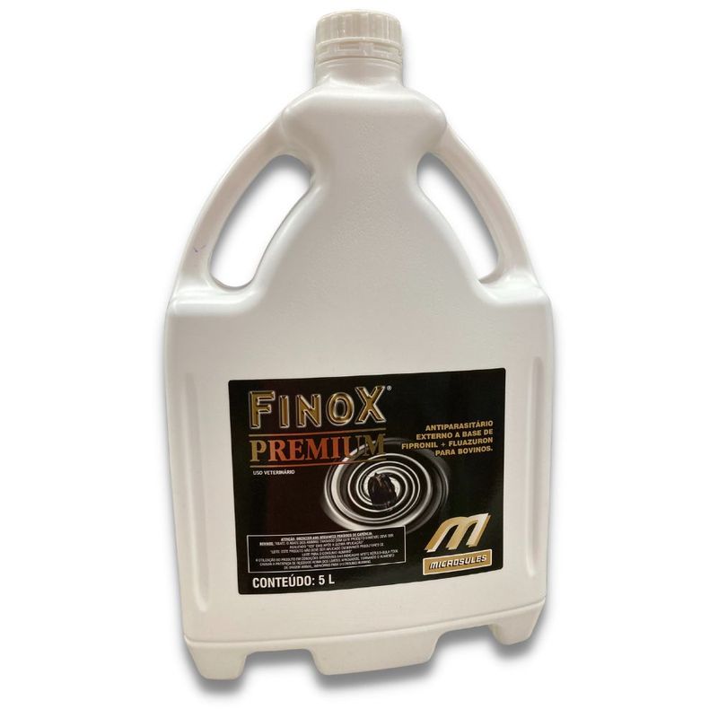 Galão de 5L para uma maior econômia! Composição: Cada 100 ml contém: Fipronil 1,0g Fluazuron 2,5g Excipientes csp 100,0 ml. Indicações: Antiparasitário externo. Devido à combinação de seus princípios ativos, a ação é alcançada em todas as etapas do ciclo do carrapato. Assassino de carrapatos, mata-mosquitos, bernicidas e mata-piolhos. Período de Carência: Carne: 100 dias. Não aplicar em fêmeas leiteiras em produção destinada ao consumo humano ou 3 meses antes do parto. Via de administração e dosagem: FINOX PREMIUM é uma solução de uso tópico para aplicação pour on. Coloque no dorso (lombo) do animal da cernelha à garupa, em duas linhas paralelas à coluna vertebral. 10 ml de FINOX PREMIUM pour on, a cada 100 kg de peso do animal (equivalente a 1,0 mg de Fipronil e 2,5 mgh de Fluazuron / kg. pc) Em casos de bezerros ao pé da mãe, não dosar, pois eles são protegidos pelo leite materno. Para sua aplicação recomenda-se o uso de luvas e roupas apropriadas a fim de evitar o contato do produto com a pele e mucosas do operador. Se utilizar o dispensador ou aplicador para sua administração, é aconselhável enxaguá-lo após o uso para prolongar sua vida útil.