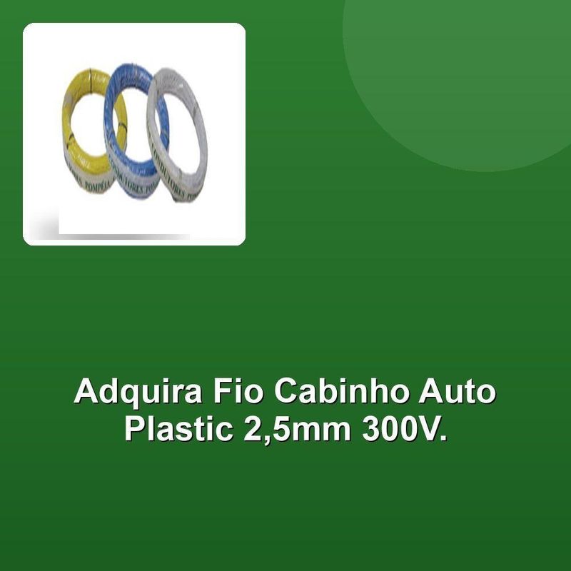 Fio Cabinho Auto Plastic Pompéia 2,5mm 300v Branco Com100mProjetamos cabos que se adaptam às necessidades mais exigentes, e o Fio Cabinho Auto Plastic Pompeia 2,50 mm 300V Rolo Com... é a prova disso. Com seu design robusto e eficaz, este fio garante segurança e confiabilidade em suas instalações elétricas. Fabricada com alta qualidade de material plástico, sua resistência é insuperável, protegendo contra impactos, desgaste e elementos externos. Seu condutor de 2,50 mm de seção, ideal para alta corrente, contribui para a eficiência do sistema elétrico e reduz a perda de energia.A tensão máxima de 300V torna essa opção perfeita para projetos residenciais e comerciais, atendendo às necessidades de iluminação, força e controle de diversos dispositivos. A venda em rolo facilita a aplicação em diferentes projetos, dispensando cortes e desperdício. Com o Fio Cabinho Auto Plastic Pompeia, você não precisa se preocupar com a qualidade dos materiais, pois cada componente é submetido a rigorosos testes para garantir a segurança e o desempenho que você merece.Acreditamos na excelência e na construção de relações duradouras com nossos clientes. Sabemos que sua satisfação é o principal motor de nosso crescimento, e por isso nos dedicamos a oferecer produtos de alta qualidade, atendimento personalizado e entregas rápidas e eficientes. Escolha o Fio Cabinho Auto Plastic Pompeia 2,50 mm 300V Rolo Com... e experimente a diferença de uma marca que se preocupa com você.Projetamos cabos que se adaptam às necessidades mais exigentes, e o Fio Cabinho Auto Plastic Pompeia 2,50 mm 300V Rolo Com... é a prova disso. Com seu design robusto e eficaz, este fio garante segurança e confiabilidade em suas instalações elétricas. Fabricada com alta qualidade de material plástico, sua resistência é insuperável, protegendo contra impactos, desgaste e elementos externos. Seu condutor de 2,50 mm de seção, ideal para alta corrente, contribui para a eficiência do sistema elétrico e reduz a perda de energia.A tensão máxima de 300V torna essa opção perfeita para projetos residenciais e comerciais, atendendo às necessidades de iluminação, força e controle de diversos dispositivos. A venda em rolo facilita a aplicação em diferentes projetos, dispensando cortes e desperdício. Com o Fio Cabinho Auto Plastic Pompeia, você não precisa se preocupar com a qualidade dos materiais, pois cada componente é submetido a rigorosos testes para garantir a segurança e o desempenho que você merece.Acreditamos na excelência e na construção de relações duradouras com nossos clientes. Sabemos que sua satisfação é o principal motor de nosso crescimento, e por isso nos dedicamos a oferecer produtos de alta qualidade, atendimento personalizado e entregas rápidas e eficientes. Escolha o Fio Cabinho Auto Plastic Pompeia 2,50 mm 300V Rolo Com... e experimente a diferença de uma marca que se preocupa com você.