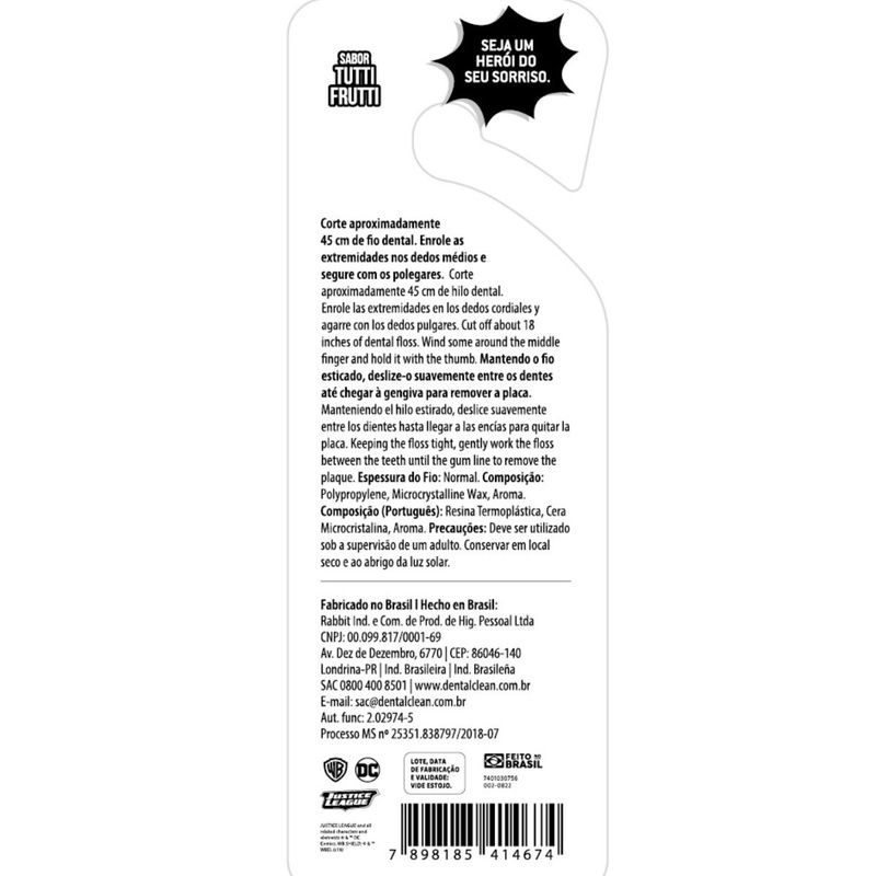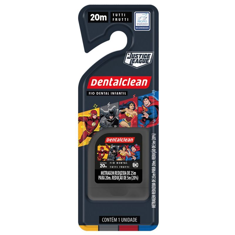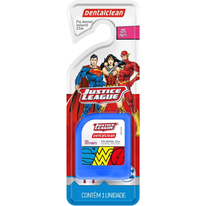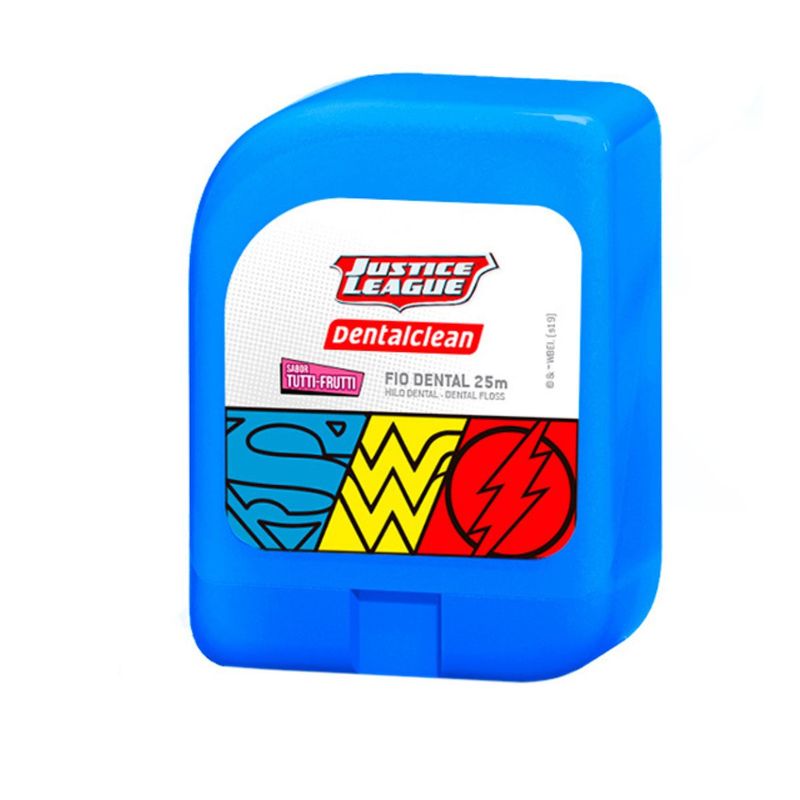 FIO DENTAL INFANTIL HERÓIS LIGA DA JUSTIÇA - 25M - TUTTI FRUTTI - DENTALCLEANO fio dental infantil possui 25 metros e sabor tutti frutti, ideal para incentivar o hábito de usar fio dental desde pequeno. Este item foi desenvolvido para ajudar os pais a completarem a higienização bucal das crianças. O fio dental infantil deve ser utilizado preferencialmente antes da escovação, depois de cada refeição. No mínimo, é recomendado passar o item uma vez ao dia entre os dentes, na escovação noturna.Entre os dois e seis anos de idade, os dentes começam a se encaixar um do lado do outro o que aumenta as chances de restos de alimentos ficarem presos nos dentes. À medida que as crianças vão desenvolvendo suas habilidades, é indicado dar sequência ao hábito de modo independente. Geralmente, as crianças conseguem dominar o uso do fio dental por conta própria por volta dos oito anos de idade. Case disponível em duas cores: azul e vermelha.