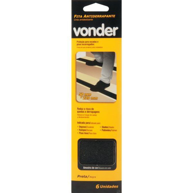 Conteúdo da embalagem1 Cartela com 6 fitas antiderrapantesAplicações e dicas de usoIndicada para locais sem incidência de umidade, como: pisos, degraus, rampas, escadas, skates, entre outrosDestaques e diferenciaisAjuda na prevenção de acidentes em pisos lisos e escorregadios DETALHES TÉCNICOS Largura x comprimento da fita antiderrapante: 50 mm x 220 mm Material da fita antiderrapante: lixa com adesivo Cor da fita antiderrapante: Preta