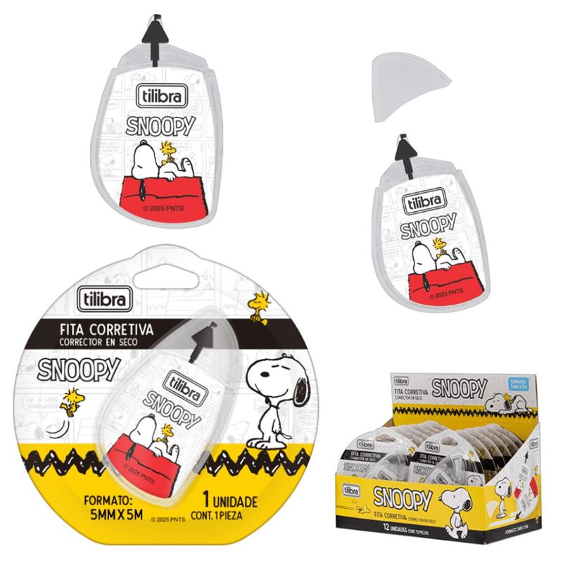 FITA CORRETIVA SNOOPY - 50MMX5M - BLISTER - 1 UNIDADE - TILIBRA Corrija seus erros com a ajuda do beagle mais querido do mundo usando a Fita Corretiva Snoopy da Tilibra! Esta fita corretiva, certificada pelo Inmetro, é perfeita para quem busca praticidade e eficiência na hora de cobrir os erros à caneta. Com um visual exclusivo do Snoopy, formato de 5mm x 5m, ela vem com uma tampa protetora e uma ponta que facilita a aplicação, garantindo uma correção limpa e precisa.Adquira agora a sua Fita Corretiva Snoopy e adicione um toque divertido ao seu material escolar!Alta qualidade: SimCódigo de barras individual: SimFácil de aplicar: SimFácil para manusear: SimMarca exclusiva: SimModelo: FitaNão tóxico: SimProduto certificado: INMETRO (Artigo Escolar/Segurança) - Registro 005889/2018Tamanho: 5mm x 5m