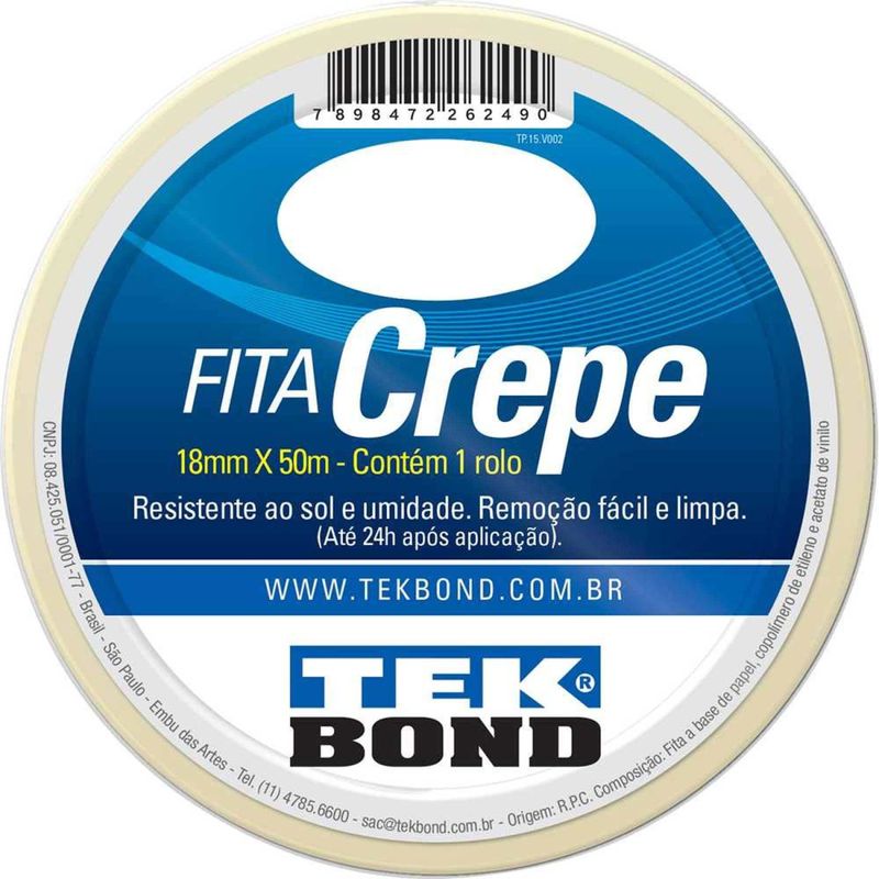 Fita Crepe, 18 mm x 50 m, Creme, uso Geral, 211110185000 Tekbond OstenVonder - Conteúdo da embalagem: 1 Fita crepe. Aplicação: Indicada para proteger, delimitar, fazer marcações, colagens e reparos temporários. Proteção, marcação e recobrimento em processos de pintura em geral (industrial, automotiva e artesanato). Emendas e reparos em restaurações diversas, como livros, revistas e artefatos em papel. Muito usada também na técnica de cartonagem e para fechar embalagens temporariamente. Ideal na hora de pintar tetos e paredes, rodapés, janelas, tomadas, guarnições (molduras de portas), sancas, objetos difÃceis de remover e outros, para evitar pinceladas ou pingos de tinta fora do lugar. Perfeita para artesanato. Atenção: produto não deve ser utilizado como isolante elétrico. Não aplicar em contato direto com alimentos. Não utilizar em superfÃcies molhadas, ou embaixo dÂágua. Instruções de utilização: as superfÃcies de aplicação devem estar limpas e secas. Retire qualquer resquÃcio de sujeira ou oleosidade. Desenrole a fita e aplique na superfÃcie desejada sem esticar, sempre aplicando sob pressão com o auxÃlio de um rolete ou espátula (não acompanham), cortando no tamanho desejado. Não deixe a fita aplicada por perÃodos superiores a 24 horas, pois pode haver migração do adesivo para a superfÃcie aplicada. Destaques: A fita crepe TEKBOND é desenvolvida com papel crepado tratado, com cola de resina e borracha. Adequado para montagem de chapas de impressão, decoração, pintura e uma infinidade de outros usos. Adere bem em diversas superfÃcies, é de fácil remoção em até 24 horas (sem deixar resÃduos), após sua aplicação. Resistente ao sol e à umidade, resistente a solventes e água. Possui excelente fixação e linha de corte precisa. Garantia - E (CDC): Garantia legal: 90 dias Referência: 21111018500 Cor da fita crepe: Creme Comprimento da fita crepe: 50 m Largura da fita crepe: 18 mm Material da fita crepe: Papel crepado tratado e resina de borracha Destaques Comercial: Fita crepe de papel tratado com cola de resina e borracha, ideal para pintura, montagem e decoração. Boa adesão, fácil remoção em até 24h, resistente a sol, umidade e solventes. Aplicação Comercial: Indicada para proteção, marcação e colagens temporárias em pintura, artesanato e restauração. Ideal para tetos, paredes e molduras. Não usar como isolante elétrico nem em contato com alimentos ou superfÃcies molhadas. Características Gerais do Produto: Garantia: • 3 Meses