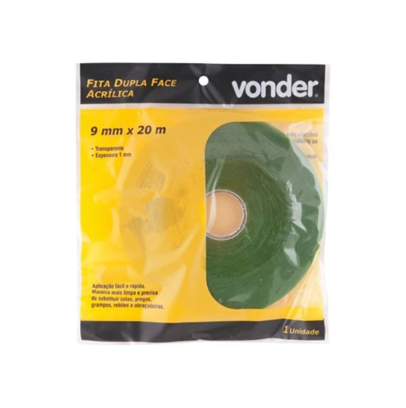 Fita dupla face acrílica, 9 mm x 20 m, VONDER Destaques e diferenciais: Aplicação fácil e rápida. Maneira mais limpa e precisa de substituir colas, pregos, grampos, rebites e abraçadeiras. Aplicações e dicas de uso: Características Técnicas: Conteúdo da Embalagem: 1 Fita dupla faceSKU: 14560668