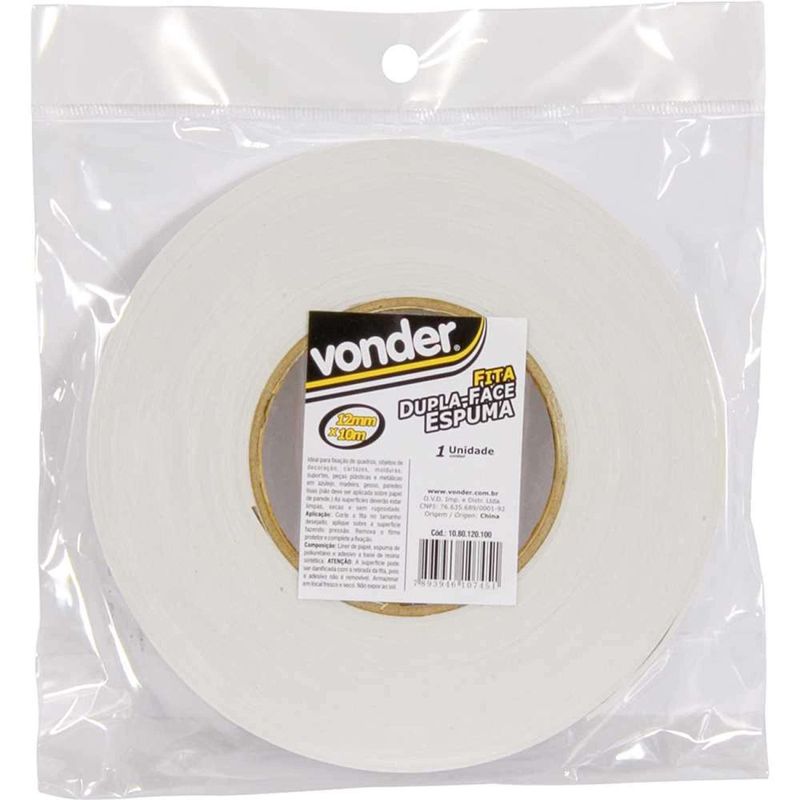 Fita Dupla Face, Espuma, 12 mm x 10,0 m, Vonder OstenVonder - Conteúdo da embalagem: 1 Fita dupla face. Aplicação: Ideal para fixação de pequenos objetos de decoração, cartazes, molduras e peças plásticas em azulejo, madeira, gesso, paredes lisas (não deve ser aplicada sobre papel de parede). A quantidade de fita depende muito do tipo de material que se está utilizando, pois a fita tem mais aderência em algumas superfÃcies (alumÃnio, aço inox, vidros) e menos adesão em outras, (plásticos e pinturas). As 2 superfÃcies devem ser sempre bem limpas com álcool isopropÃlico antes da aplicação. Destaques: Aplicação fácil e rápida. Maneira mais limpa e precisa de substituir colas, pregos, grampos, rebites e abraçadeiras. Referência: 1080120100 Garantia - E (CDC): Garantia legal: 90 dias Largura: 12 mm Comprimento: 10 m Cor da fita dupla face: Branca Espessura da fita dupla face: 1,30 mm Material da fita: Espuma de poliuretano Destaques Comercial: Aplicação fácil e rápida; substitui colas, pregos, grampos, rebites e abraçadeiras. Aplicação Comercial: Fita ideal para fixar pequenos objetos em superfÃcies lisas. Adere melhor a alumÃnio, aço inox e vidro, menos a plásticos e pinturas. Limpar com álcool isopropÃlico antes da aplicação. Características Gerais do Produto: Garantia: • 3 Meses