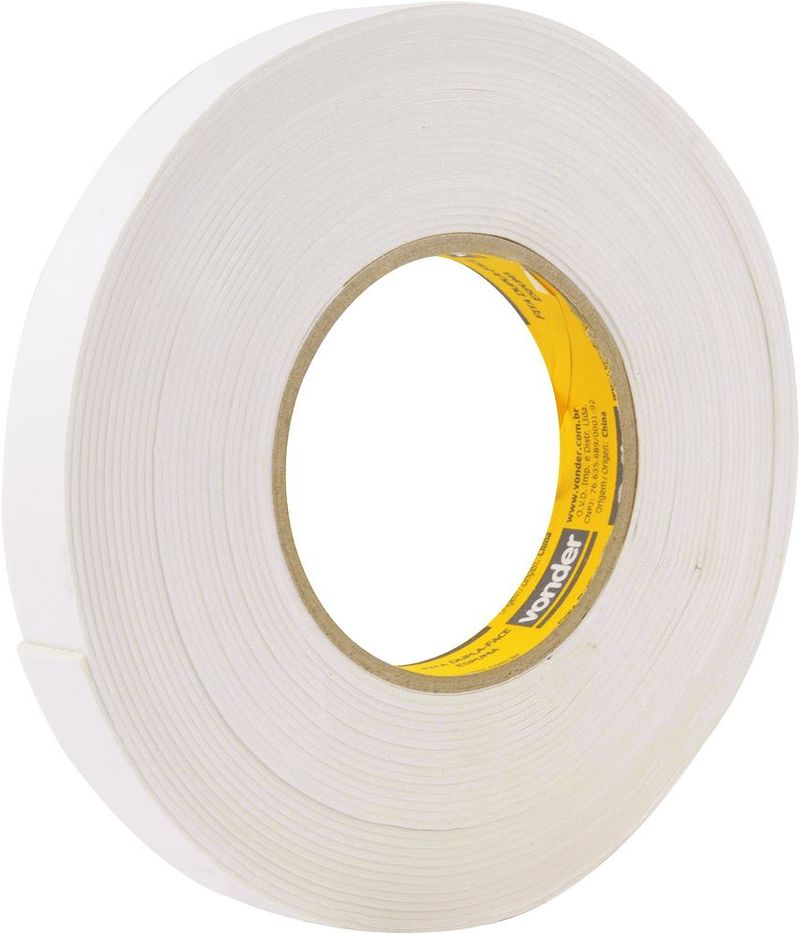 Fita Dupla Face Espuma 19mmx10m Branca - VonderA Fita Dupla Face Espuma da Vonder é a solução ideal para quem busca praticidade e eficiência na fixação de objetos. Com 19mm de largura e 10m de comprimento, esta fita é perfeita para fixar quadros, objetos de decoração, cartazes, molduras, suportes, peças plásticas e metálicas em superfícies como azulejo, madeira, gesso e paredes lisas. Evite o uso em papel de parede para garantir a melhor aderência. A fita é composta por um liner de papel, espuma de poliuretano e adesivo, garantindo uma fixação segura e duradoura. A Vonder é uma marca reconhecida pela qualidade e inovação em seus produtos, oferecendo soluções práticas para o dia a dia. Com esta fita dupla face, você evita furos indesejados nas paredes, mantendo a estética do ambiente. Além disso, a aplicação é limpa e fácil, sem sujeira ou complicações.**ESPECIFICAÇÕES TÉCNICAS**- Tipo de fita adesiva: Dupla face- Marca: Vonder- Comprimento: 10 m- Modelo: 7893946107444- Largura: 19 mm- Cor: Branca- Espessura: 1,4 mm- Material: Liner de papel, espuma de poliuretano e adesivo**FUNÇÕES E CARACTERÍSTICAS**- Fixação segura e duradoura- Ideal para superfícies lisas- Evita furos em paredes- Fácil aplicação e remoção**INSTRUÇÕES DE USO**1. Limpe a superfície onde a fita será aplicada, removendo poeira e gordura.2. Corte a fita no tamanho desejado.3. Aplique a fita na superfície, pressionando firmemente.4. Fixe o objeto desejado sobre a fita, pressionando novamente para garantir a aderência.**ITENS INCLUSOS**- 1 Fita dupla face