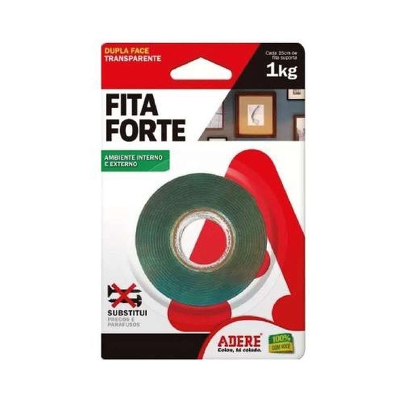 Fita Dupla Face Forte 24mm X 2 Metros - Fixação De Quadros E DecoraçãoFita Dupla Face Forte 24mm x 2 Metros - Fixação de Quadros e Decoração -FITA DUPLA FACE FORTE 24MM X 2 METROS - ADEREEstá cansado de tentar pendurar quadros e objetos de decoração sem sucesso? A fita dupla face forte Adere veio para resolver seus problemas! Com ela, você pode fixar seus itens de decoração de forma prática e segura, sem precisar fazer furos nas paredes. Seja na sala, no quarto ou no escritório, essa fita é a solução ideal para quem busca praticidade e eficiência na hora de decorar.Com 24mm de largura e 2 metros de comprimento, a fita dupla face Adere é versátil e resistente, podendo ser aplicada em uma variedade de superfícies, como vidros, acrílicos, paredes, madeiras com verniz ou pintadas, metais e revestimentos de porcelanato e azulejo. Além disso, seu adesivo forte garante uma fixação segura e duradoura, sem deixar resíduos ao ser removida.Não perca mais tempo com ferramentas e suportes complicados. Com a fita dupla face forte Adere, você consegue decorar sua casa de forma rápida e sem complicações. Transforme seu ambiente com praticidade e estilo, experimente agora mesmo!* Ideal para quadros, objetos de decoração, canaletas e placas em geral* Versátil: pode ser aplicada em vidros, acrílicos, paredes, madeiras, metais e revestimentos* Adesivo forte: fixação segura e duradoura* Fácil de usar: sem furos, sem bagunça* Tamanho: 24mm x 2 metrosInformações Técnicas:- Marca: Adere- Modelo: Fita Dupla Face Forte- Medidas: 24mm x 2 metros- Indicações de Uso: Quadros, Objetos de Decoração, Canaletas, Placas em Geral- Superfícies: Vidros, Acrílicos, Paredes, Madeiras com verniz ou pintadas, Metais, Revestimentos (Porcelanato e Azulejo)Não perca mais tempo e garanta já a sua fita dupla face forte Adere para facilitar a decoração da sua casa! Qualidade e praticidade que só a Adere Universo do Lar pode oferecer. --------Descrição Original enviada pelo Fornecedor:FITA DUPLA FACE FORTE 24MM X 2 METROS - ADEREAplicação: Quadros, Objetos de Decoração, Canaletas, Placas em Geral.Superfícies: Vidros, Acrílicos, Paredes, Madeiras com verniz ou pintadas, Metais e Revestimentos (Porcelanato e Azuleijo).Características Gerais do Produto:Garantia: - 3 meses