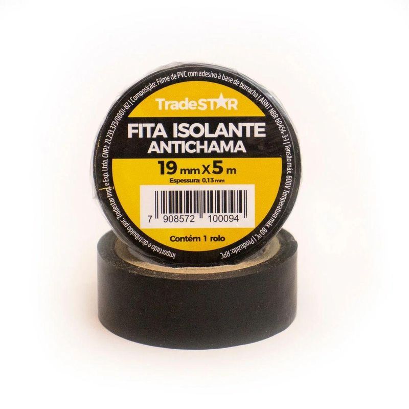Fita Isolante 19 Mm X 5 Metros TradestarFita Isolante Tradestar PVC Antichama Isolamento Elétrico 19 mm x 5 Metros PretaA Fita Isolante Tradestar PVC Antichama 19 mm x 5 metros é um item indispensável para qualquer profissional da área elétrica, instaladores, técnicos de manutenção ou até mesmo para quem gosta de realizar pequenos reparos e projetos domésticos. Fabricada em PVC de alta qualidade, esta fita foi desenvolvida para garantir segurança, resistência e praticidade, atendendo às principais necessidades de isolamento elétrico e organização de cabos.Com propriedades antichama, a fita proporciona uma camada de proteção extra contra riscos de curto-circuito e propagação de fogo, tornando-se ideal para aplicações em ambientes que exigem maior confiabilidade. Além disso, sua cor preta confere acabamento discreto e profissional, integrando-se facilmente a diferentes tipos de instalações.Outro diferencial é sua versatilidade de uso. Além da função principal de isolamento elétrico, a Fita Isolante Tradestar também pode ser aplicada na organização de fios e cabos, marcação de áreas, fixações temporárias e até mesmo em pequenos reparos emergenciais. Sua flexibilidade permite que se adapte tanto a superfícies lisas quanto irregulares, sem perder a capacidade de aderência.No quesito resistência, a fita é projetada para suportar até 600V de tensão elétrica e temperaturas de até 80°C, oferecendo segurança em condições de uso intensivo. Isso garante que ela possa ser aplicada em diferentes contextos sem comprometer a eficiência ou durabilidade.Seja para o uso doméstico em pequenas instalações, ou para o uso profissional em manutenções mais exigentes, a Fita Isolante Tradestar 19 mm x 5 m é a escolha certa para quem procura qualidade e confiança em uma ferramenta tão essencial.Especificações- Dimensões: 19 mm x 5 metros- Cor: Preta- Isolamento elétrico: até 600V- Temperatura máxima suportada: até 80°C- Indicação de uso: Isolamento elétrico, organização de cabos, fixação temporária e uso geralItens inclusos- 01 Rolo de Fita Isolante 19 mm x 5 Metros TradestarGarantia- 03 meses com o Fabricante NA