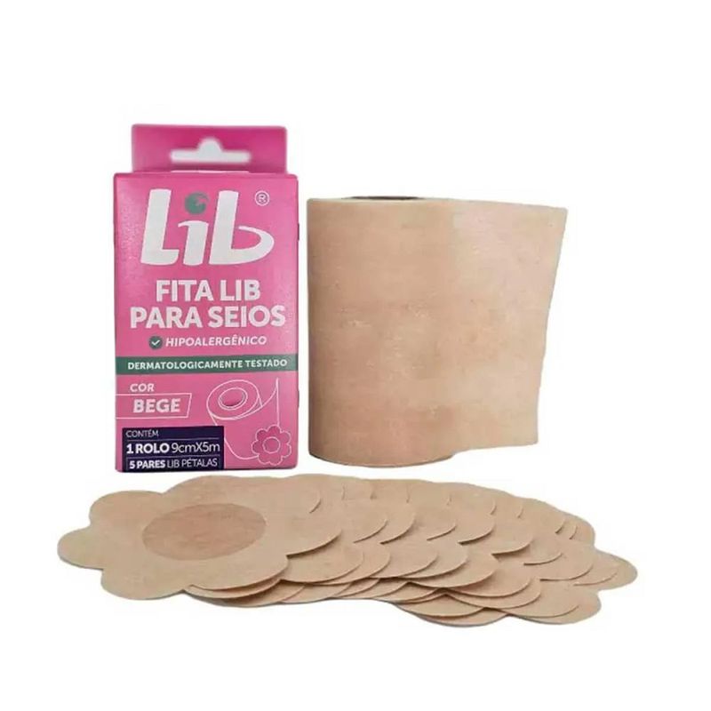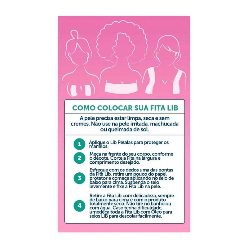 O Que É a Fita Lib para Seios e Para Que Serve? A Fita Lib para Seios é a solução perfeita para quem busca conforto e discrição em roupas finas. Feita com um tecido delicado na cor bege, ela se adapta perfeitamente ao corpo sem marcar ou ser visível. Hipoalergênica e resistente ao suor, a Fita Lib garante segurança e bem-estar durante todo o dia. Cada embalagem inclui um rolo de fita bege com 9 cm de largura e 5 metros de comprimento, além de 5 pares de Lib Pétalas para proteger os mamilos do contato direto com o adesivo. Como Utilizar a Fita Lib para Seios?Aplicação da Fita: Certifique-se de que a pele esteja limpa, seca e sem cremes.Primeiro, aplique as Lib Pétalas nos mamilos para proteção extra.Meça e corte a fita conforme o decote desejado, ajustando a largura e o comprimento.Esfregue uma das extremidades da fita com os dedos, retire parcialmente o papel protetor e comece a aplicar na parte inferior do seio, subindo em direção ao topo.Levante o seio suavemente e fixe a fita na pele para garantir uma aderência adequada.Remoção da Fita: Retire a fita com cuidado, sempre de baixo para cima e com a pele completamente seca.Evite retirar a fita durante o banho ou com água.Se encontrar dificuldades, umedeça a fita com óleo para seios LIB para uma remoção mais fácil. Recomendações de Uso: Faça um teste na pele antes da aplicação completa.A Fita Lib é resistente ao suor e pode ser usada por até 10 horas.Não exceda esse tempo para evitar possíveis irritações na pele.Não use água, álcool, acetona ou produtos semelhantes para remover a fita ou resíduos.Após a remoção, a fita não pode ser reutilizada.ComposiçãoAdesivo acrílico e viscose. Advertências: Uso externo apenas.Aprovada clinicamente, fabricada com adesivo hipoalergênico e tecido microporoso para permitir a respiração da pele.Não utilize em pele irritada, machucada ou queimada pelo sol.Não é recomendada para gestantes, lactantes ou peles sensíveis.Caso ocorra irritação ou alergia, interrompa o uso e consulte um médico.Armazene o produto em local seco, longe da luz e do calor.Mantenha fora do alcance das crianças.