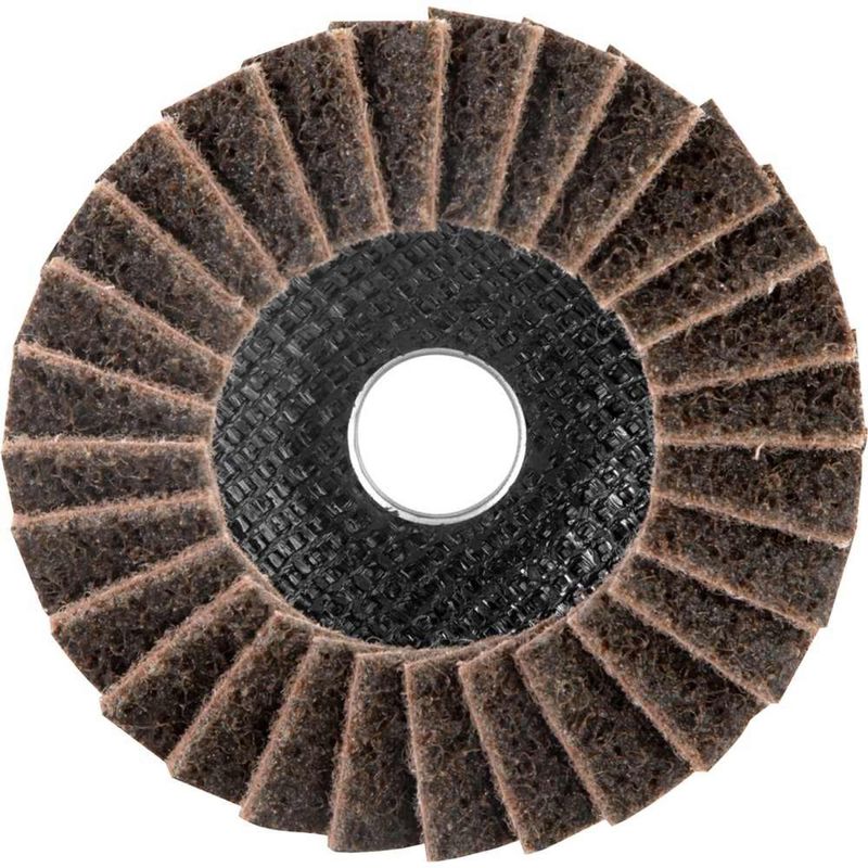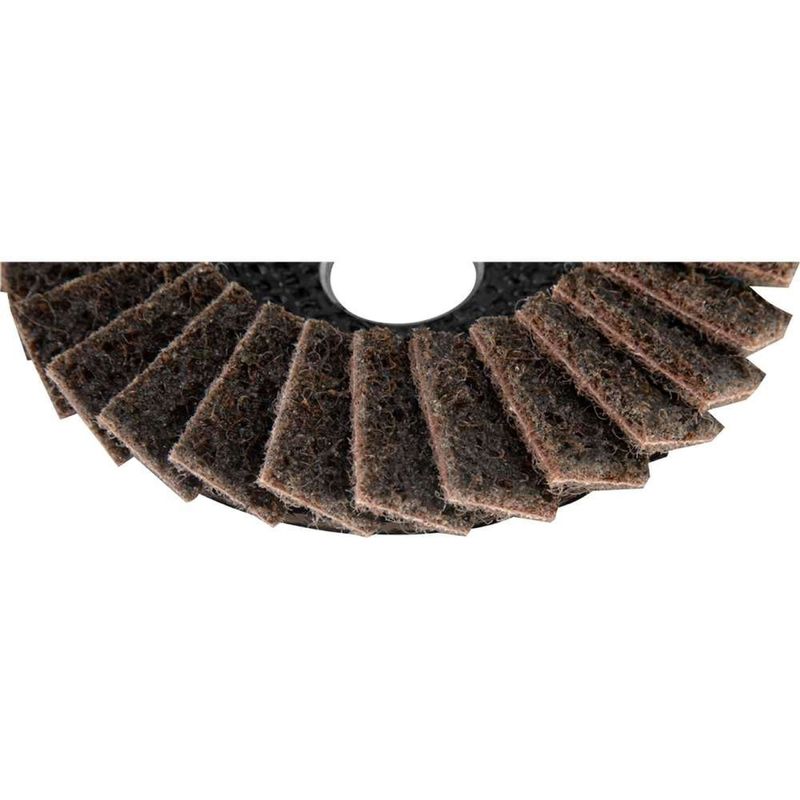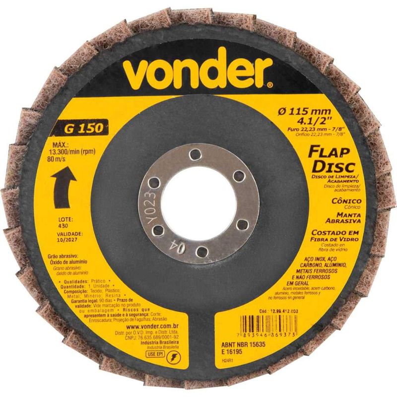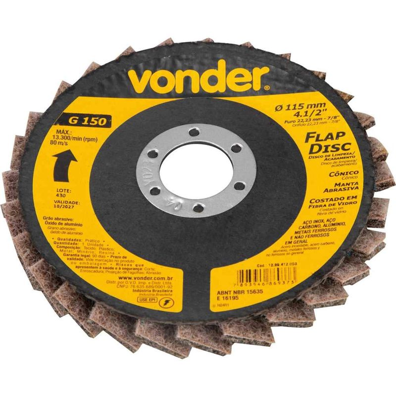 Flap-disc, Disco de Limpeza/acabamento, 4.1/2" - 115 mm, Cônico, Manta Abrasiva, Grosso, Vonder OstenVonder - Conteúdo da embalagem: 1 Disco de desbaste/acabamento flap-disc. Aplicação: Indicado para limpeza, acabamento e polimento de diversos tipos de superfÃcies em aço inox, aço carbono, alumÃnio, metais ferrosos e não ferrosos em geral. Destaques: Permite atividades de desbaste e acabamento ao mesmo tempo, eliminando a troca de discos. Proporciona menor vibração e ruÃdo comparado com o disco de desbaste convencional. Utilizar em esmerilhadeiras angulares. Referência: 1299412003 Garantia - E (CDC): Garantia legal: 90 dias Tipo do perfil do disco de desbaste/acabamento flap-disc: Cônico Massa aproximada (peso): 0,072 kg Velocidade periférica (máx.): 80 m/s Norma de referência: ABNT NBR 15635 / ABNT NBR 16195 Grão: G 150 Tipo do grão abrasivo: Ãxido de alumÃnio Tipo de costado: Fibra de vidro Diâmetro externo do disco de desbaste/acabamento flap-disc: 4.1/2" - 115 mm Diâmetro do furo do disco de desbaste/acabamento flap-disc: 7/8" - 22,23 mm Rotação máxima - rpm: 13.300/min Destaques Comercial: Permite desbaste e acabamento simultâneos, reduz vibração e ruÃdo. Uso em esmerilhadeiras angulares. Aplicação Comercial: Para limpeza, acabamento e polimento de superfÃcies em aço inox, carbono, alumÃnio e outros metais. Características Gerais do Produto: Garantia: • 3 Meses