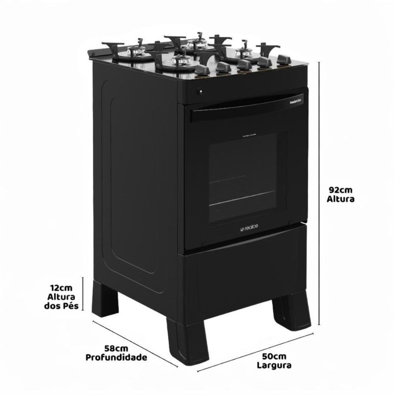Fogão 4 Bocas A Gás Premium Glass Realce CR228 Preto BivoltLeve mais eficiência e sofisticação para o coração da sua casa com o Fogão 4 Bocas a Gás Bivolt Premium Glass Realce CR228. Desenvolvido para proporcionar praticidade no preparo das refeições, ele combina desempenho confiável com um design moderno que valoriza o ambiente. Ideal para o dia a dia, é a escolha certa para quem deseja cozinhar com mais conforto, organização e um toque de elegância na cozinha.Diferenciais:- Mesa em vidro temperado de 6mm: mais resistência e segurança no uso diário, além de um visual moderno que valoriza a cozinha e facilita a limpeza.- 4 bocas com trempes de ferro fundido com seis pontos de apoio: proporcionam melhor estabilidade para panelas e mais segurança durante o preparo das receitas.- Forno com 50 litros de capacidade: espaço ideal para preparar diferentes receitas com praticidade no dia a dia.- Tecnologia 100% Cleartec no forno: facilita a limpeza interna e evita o acúmulo de gordura.- Amplo visor e luz interna no forno: permite acompanhar o preparo dos alimentos sem precisar abrir a porta.- Puxador em alumínio escovado: mais resistência e um visual moderno que valoriza o design do produto.- Manipuladores ergonômicos e texturizados com acendimento automático total: oferecem controle preciso da chama e mais conforto no manuseio.- Alimentação: gás GLP.- Voltagem: Bivolt (127V/220V).- Ignição automática: acendimento rápido e prático.Conteúdo da Embalagem:1 (um) Fogão 4 BocasManualDimensões do Produto:Altura: 92cm | Largura: 50cm | Profundidade: 58cm*Você pode consultar as medidas detalhadas na imagem técnica do produto.*As cores do produto podem sofrer variações de tonalidade de acordo com as configurações do seu dispositivo.*Imagem meramente ilustrativa. Decoração não acompanha o produto. Tonalidade: Branco | Referência do Modelo: CR228 | Conteúdo da Embalagem: 1 fogão e manual. | Altura Montado: 92 | Largura Montado: 50 | Profundidade Montado: 58 | Tamanho (L x A x P): 50 x 92 x 58 | Peso do Produto: 22 | Fabricante: Realce | Produto: Fogão | Voltagem: 127/220 | Alimentação: a Gás | Quantidade de Bocas: 4 | Altura (cm): 92 cm | Largura (cm): 50 cm | Profundidade (cm): 58 cm | Tipo de Montagem: De chão | Tipo de Instalação: Apoio | Altura do Produto com Embalagem: 58 cm | Largura do Produto com Embalagem: 50 cm | Comprimento do Produto com Embalagem: 80 cm | Peso do Produto com Embalagem: 22000 g | Tempo de Garantia: 12 meses | Tensão Elétrica: Bivolt | Quantidade de queimadores elétricos: 0 | Registro INMETRO: 005197/2018 | Tipo de porta do forno: Com visor | Tipo de gás: GLP | Eficiência energética: A | Com Estufa: Não | Tipo de ignição: Automático | É Industrial: Não | Com Forno duplo: Não | Com Tampa: Não | Com Temporizador: Não | Com Válvulas de segurança: Sim | Baterias são necessárias?: Não | Certificação de teste externa: 005197/2018 | Is Fragile: Sim | Dimensões do item P x L x A: depth#value=58;depth#unit=centimeters;height#value=50;height#unit=centimeters;width#value=92;width#unit=centimeters | Quantidade de itens: 1 | Número da peça: CR228.T01 | Peso do pacote: unit=kilograms;value=22 | Destaque 1: Trempes individuais em ferro fundido: garantem estabilidade para suas panelas. | Destaque 2: Mesa de vidro temperado de 6mm. | Destaque 3: Base do queimador esmaltada: facilita a limpeza após o uso. | Destaque 4: Acendimento automático na mesa e forno. | Destaque 5: Com capacidade de 50 litros. | Elemento de aquecimento: Selado | O item é autorizado pelo OEM?: Sim | Fonte de energia: Movido a gás | Quantidade de caixas de embalagem: 01 | Descrição da garantia: Garantia Legal para vícios ou defeitos de fabricação (art. 26, II, CDC) | Modelo alfanumérico: N/A | Tipo de Garantia: Garantia do Fabricante | Montagem: Necessita Montagem | País de Origem: Brasil | Tipo da embalagem do vendor: Sem embalagem adicional | Cor: Preto