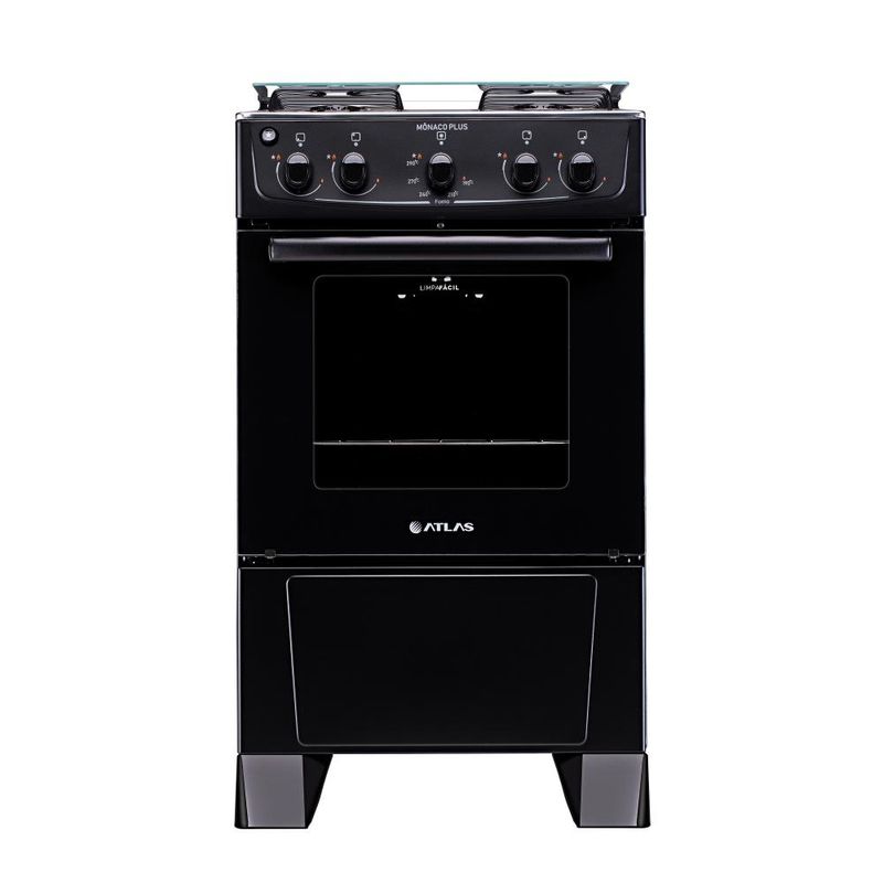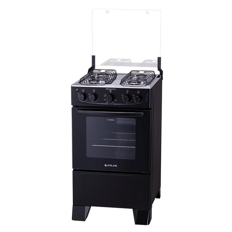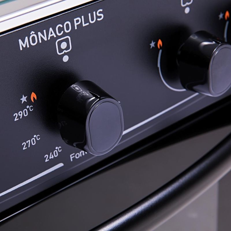 Possui mesa em inox, tampa de vidro na mesa, grades duplas de aço esmaltado, acendimento automático e botões removíveis – que facilita na hora da limpeza.A versão 4 bocas possui 2 queimadores de 1,7kW e 2 queimadores Família de 2,0kW.O forno possui visor amplo na porta, que permite enxergar tudo o que está dentro, capacidade de 50 litros com dimensões de 37 x 30 x 45 cm, acabamento limpa fácil, 1 grade deslizante e porta com vidro duplo - que preserva o calor.Ficha Técnica:Voltagem: BivoltPadrão de Tomada: 10ACor: PretoLinha: Monaco PlusQuantidade de Bocas: 4 bocasTipo de Acendimento: AutomáticoGarantia: 12 MesesAcabamento da Mesa: InoxInstalação: Fogão de PisoTurbo Convecção: NãoDimensões do Produto (largura x altura x profundidade) 48 x 88,6 x 58,5 cmDimensões Internas do Forno (largura x altura x profundidade) 37 x 30 x 45 cmGrill: NãoFuncionamento : GásCapacidade do Forno: 50 LitrosAcabamento do Forno: Limpa FácilLuz no Forno: NãoVidro do Forno: Vidro DuploTampa: SimTrempes: Trempe dupla em aço esmaltadoGrades do Forno: 1 Grade deslizanteTimer Digital: NãoBotões Removíveis: SimFabricação: NacionalPotência dos Queimadores: 2Q Ramal de 1,7kW e 2Q Família de 2,0kWSistema Corta/Bloqueia Gás: NãoEficiência Energética: ADÚVIDAS FREQUENTESEste Fogão é para uso com Botijão de Gás?R: Este modelo sai de fábrica para funcionar com gás de botijão, o GLP.É possível realizar a conversão de botijão para Gás Natural (GN)/gás de rua?R: Sim, todos os nossos fogões podem ser convertidos para trabalhar com gás natural, o GN, ou gás de rua. A conversão é gratuita e deve ser solicitada após a entrega do fogão. O prazo após solicitação é de 48h para agendamento da conversão. Lembrando que você tem 90 dias para solicitar a conversão após a chegada do produto.Qual é o lado da mangueira do fogão?R: A saída é do lado esquerdo olhando o fogão de frente. Caso você queira colocar para o outro lado, deverá acoplar uma mangueira metálica e utilizar na transversal para evitar corrosão.