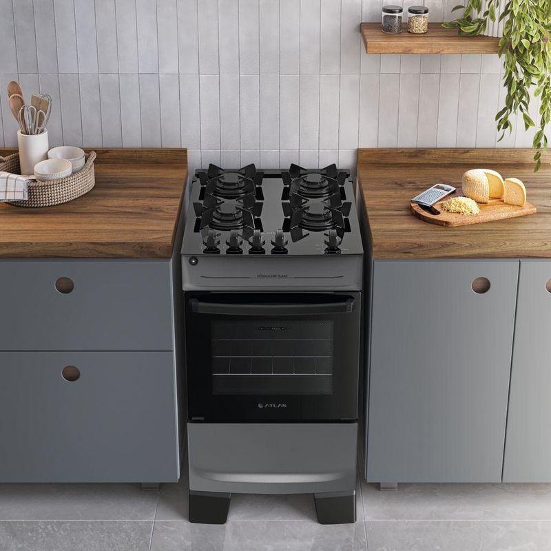 Fogão 4 Bocas Atlas Mônaco Top Glass Automático Mesa De Vidro Titanium BivoltFogão 4 bocas Atlas Mônaco Top Glass Automático Mesa de Vidro TitaniumJá imaginou um fogão com mesa de vidro que também seja prático no dia a dia? A Atlas pensou nisso e criou o Mônaco Top Glass, um produto que combina beleza, segurança e simplicidade em um só fogão.Os pés já vêm montados, prontos para uso. Com mesa de vidro temperado e botões posicionados na mesa, ele é fácil de usar e ainda traz um toque moderno que transforma qualquer cozinha.As grades de aço com 6 apoios mantêm as panelas firmes, garantindo mais segurança durante o preparo. Já o forno e os queimadores com tecnologia Limpa Fácil simplificam a limpeza e ajudam você a economizar tempo no dia a dia.Feito por quem entende do assunto, o Mônaco Top Glass carrega a confiança de uma marca presente há anos nas casas brasileiras. Porque quando o fogão é Atlas, você sabe que foi feito para facilitar sua vida.Bonito, moderno e feito para durar.DiferenciaisMais bonito, resistente e versátil: design que combina com qualquer cozinhaBotões no topo da mesa: visual moderno e controle práticoGrades com 6 apoios: mais estabilidade para as panelasForno e queimadores Limpa Fácil: praticidade na limpezaAcendimento automático: girou, clicou e acendeu, sem fósforo ou isqueiroVidro interno do forno removível: facilita a limpeza completaVisor do forno: acompanhe suas receitas sem abrir a portaPuxador de aço: firme, seguro e confortávelPés altos e já montados: mais praticidade no uso e na limpezaBotões removíveis: limpeza rápida e fácilCaracterísticas TécnicasMarca: AtlasModelo: Mônaco Top GlassTipo: De PisoCor: TitaniumAlimentação: GásTensão: BivoltMesa e AcendimentoTipo de mesa: VidroTrempe: Individual de aço com acabamento Limpa FácilAcendimento: AutomáticoTampa/Testeiro: TesteiroBotões removíveis: SimQueimadoresQuantidade: 4Tripla/Dupla chama: NãoPotência total: 7,34 kWFornoCapacidade: 48LPotência: 1,78 kWAcabamento interno: Esmalte Limpa FácilPrateleira: 1 deslizanteLuz interna: NãoVidro da porta: Duplo temperadoVisor: TotalVálvula de segurança: SimDimensões e PesoAltura: 87,7 cmLargura: 48 cmProfundidade: 56,4 cmPeso: 19,25 kgGarantia1 ano (3 meses de garantia legal + 9 meses para defeitos de fabricação)Observações ImportantesConferir o produto no ato da entrega. Em caso de avarias, recuse o recebimentoInformações podem sofrer alterações sem aviso prévioImagens meramente ilustrativas